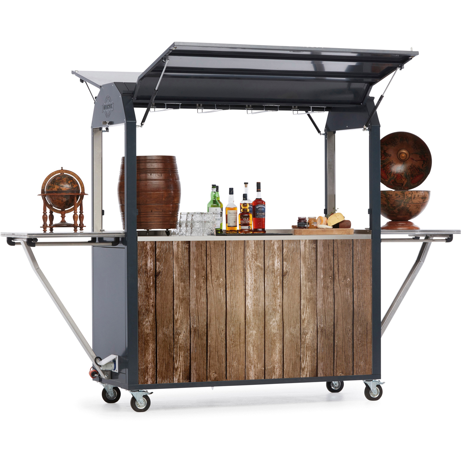 - Geeignet für Getränke und Lebensmittel für Innen- und Außenbereich, - Multifunktionell einsetzbar, - 4 Lagerräder mit Bremse, - Arbeitsflächen aus hochwertiges Edelstahl, - Beleuchtung LED warmweiß ( 0,18 KW), - 6 verchromte Glasschienen, - 2 spritzwassergeschützte Steckdosen (IP54), - Barcooler 330 liter mit 3 Glastüren/Schiebetüren bestellbar unter 437-1030 oder 437-1040, - 2 klappbare Beistelltische aus Edelstahl, - Mit 6 Schlössern gesichert, - Abm.: B 1543 x T 642 x H 1975 mm