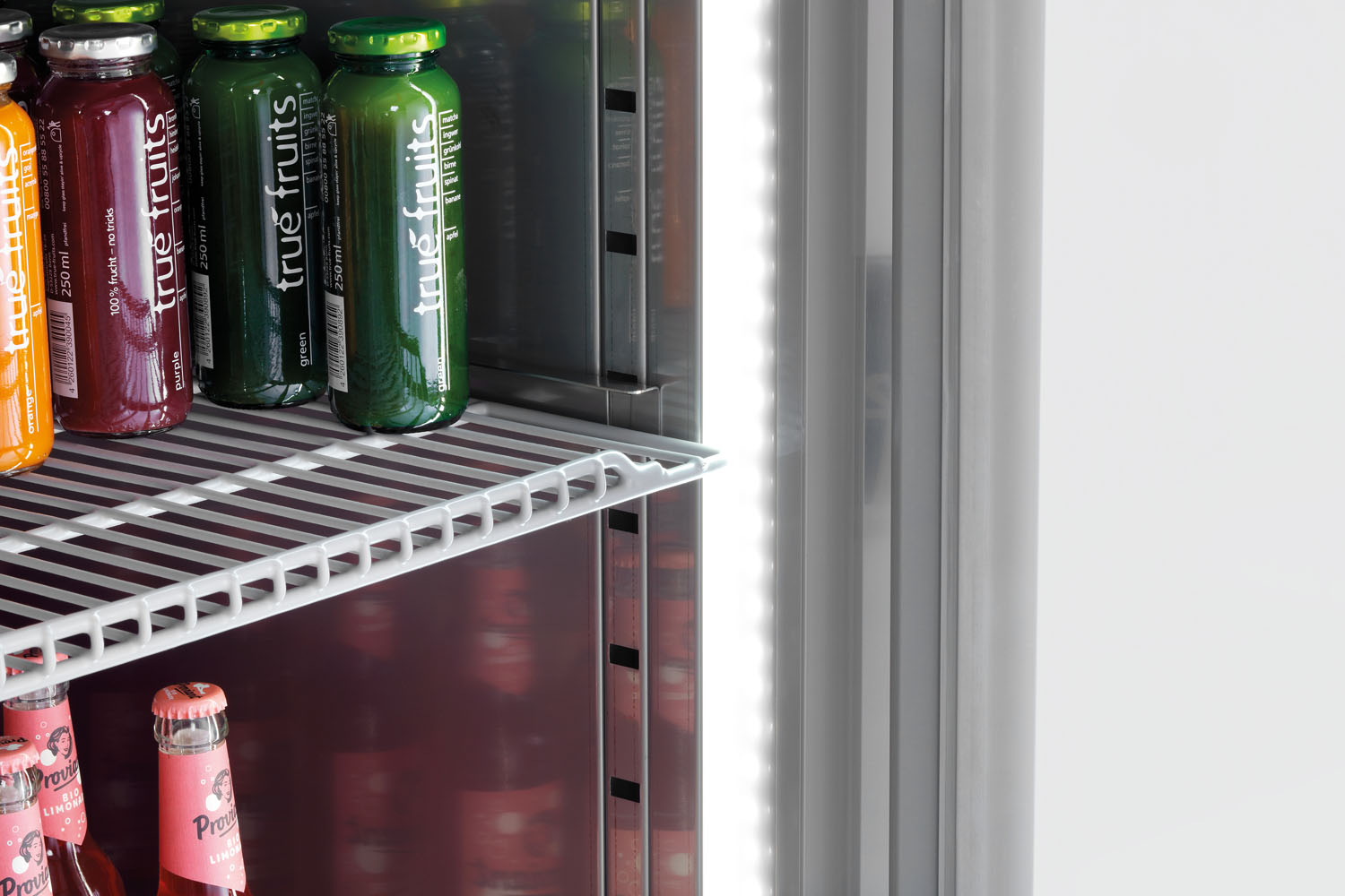 Solide Edelstahlausführung im ansprechenden Design, in Aluminium gerahmte Glastüren und eine hochwertige LED-Beleuchtung sind beste Voraussetzungen für eine perfekte Warenpräsentation. Der doppeltürige Kühlschrank mit Einschüben im 2/1 GN-Format verleitet förmlich zu Impulskäufen.
