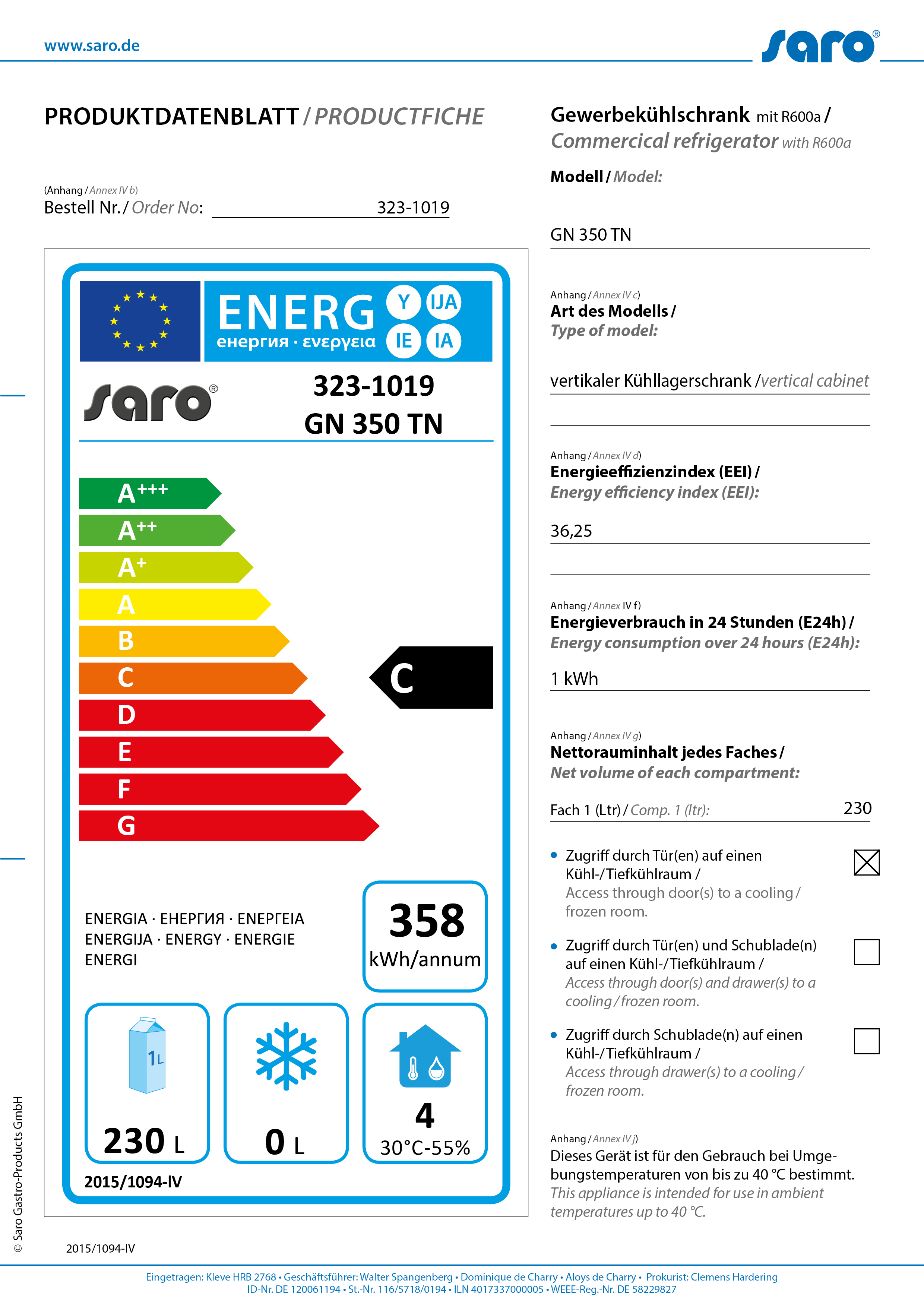 - Download Datenblatt Kühlschrank mit Umluftkühlung 350 Liter saro 323-1019