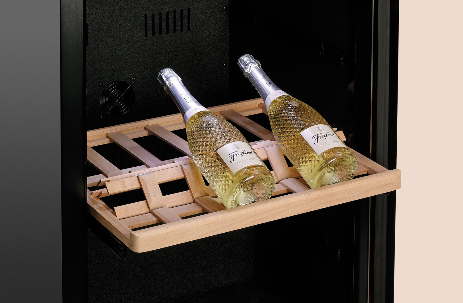 Für eine perfekte Weinpräsentation: Der extra für den Weinkühlschrank 2Z 126FL ausgelegte Weinpräsenter bietet Platz für bis zu 6 Flaschen, die dank des Klappmechanismus wahlweise in einem 25°-Winkel oder auch horizontal präsentiert werden können.