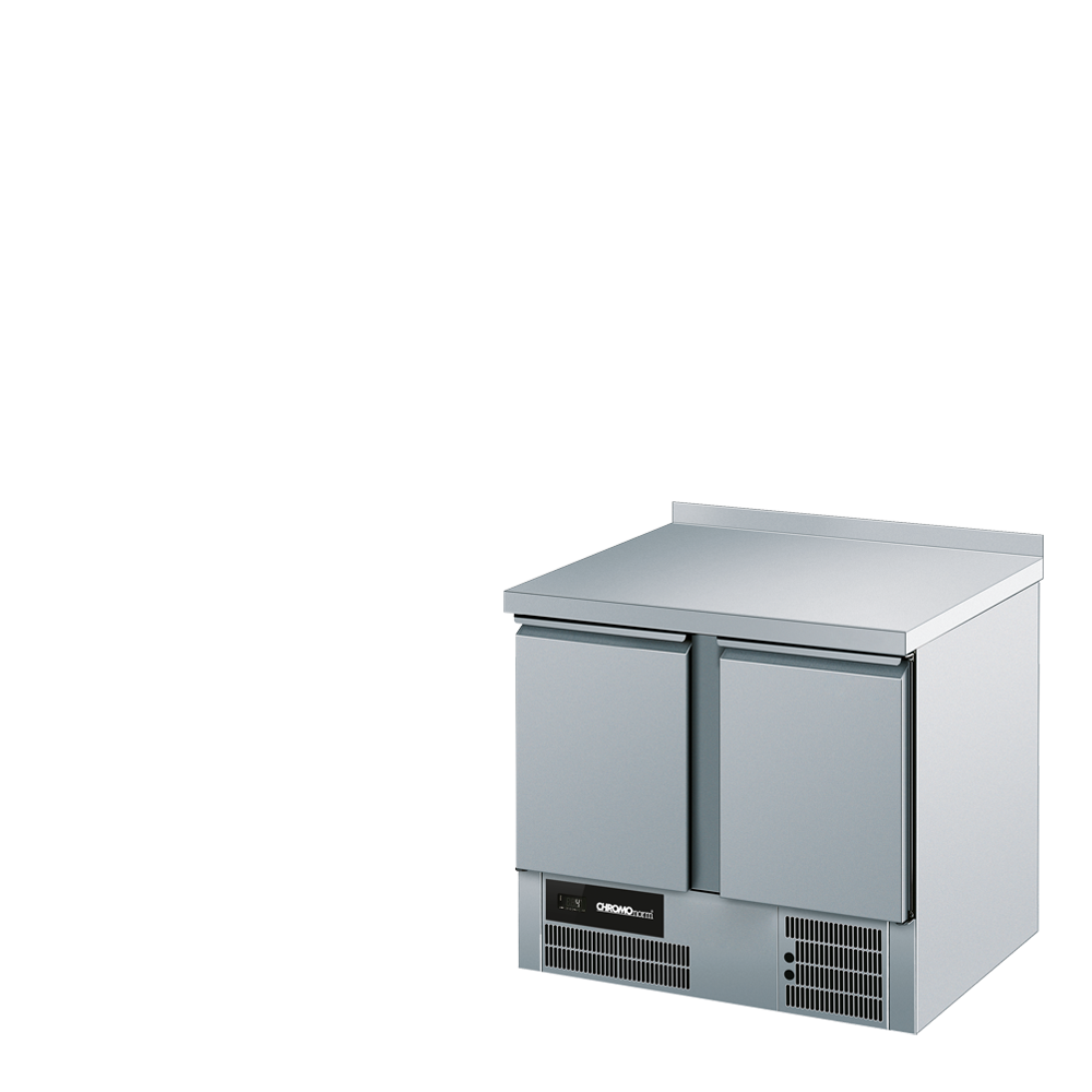 KÜHLTISCH BR 795, GN 1/1, 2 TÜREN, MIT TISCHPLATTE HINTNEN AUFGEKANTET.Tischplatte (50 mm) aus CNS 18/10, schalldämmend unterfüttert und mit umlaufendem Profil verstärkt. Mit Aufkantung 50 mm hinten. Kühlkorpus in einem Stück hochdruckgeschäumt, innen und außen aus Edelstahl. Verdampferfreier Innenraum. Steckerfertige Umluftkühlung mit unverwüstlich komplett in der Rückwand eingeschäumtem Verdampfer, automatischer Abtauung und Tauwasserverdunstung. Elektronische Regelung mit Digitalanzeige und beleuchtetem EIN-/AUS-Schalter. Geteilte Maschinenfachblende ohne Werkzeug zur Kondensatorreinigung demontierbar. Flügeltüren jeweils in einem Stück hochdruckgeschäumt, mit integrierter Griffleiste und leicht auswechselbarer Magnet-Dichtung. Mit 4 Ausgleichsfüßen. 2 kippsichere höhenverstellbare U-Auflageschienenpaare und 2 Tragroste GN 1/1 aus CNS 18/10 als Zubehör. Sockelbaufähig. Tischplatte nicht abnehmbar. Temperaturbereich +2 / +12 °C. Anschlusswert 320 W / 230 V / 50 Hz. Kältemittel R290. Kälteleistung 310 W -10 °C VT. Energieverbrauch in 24h 2,4 kWh.