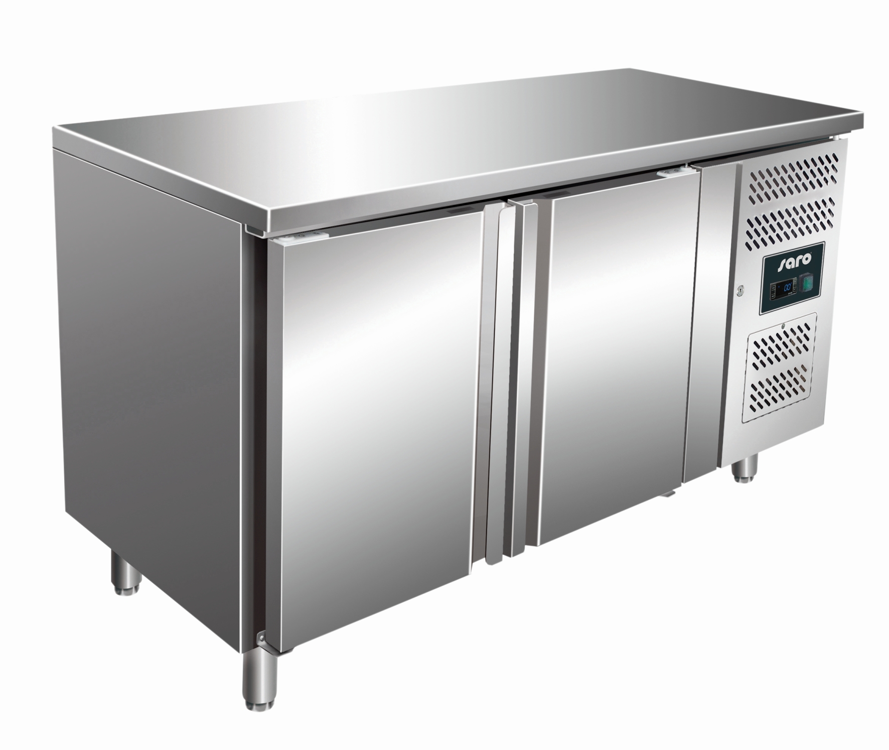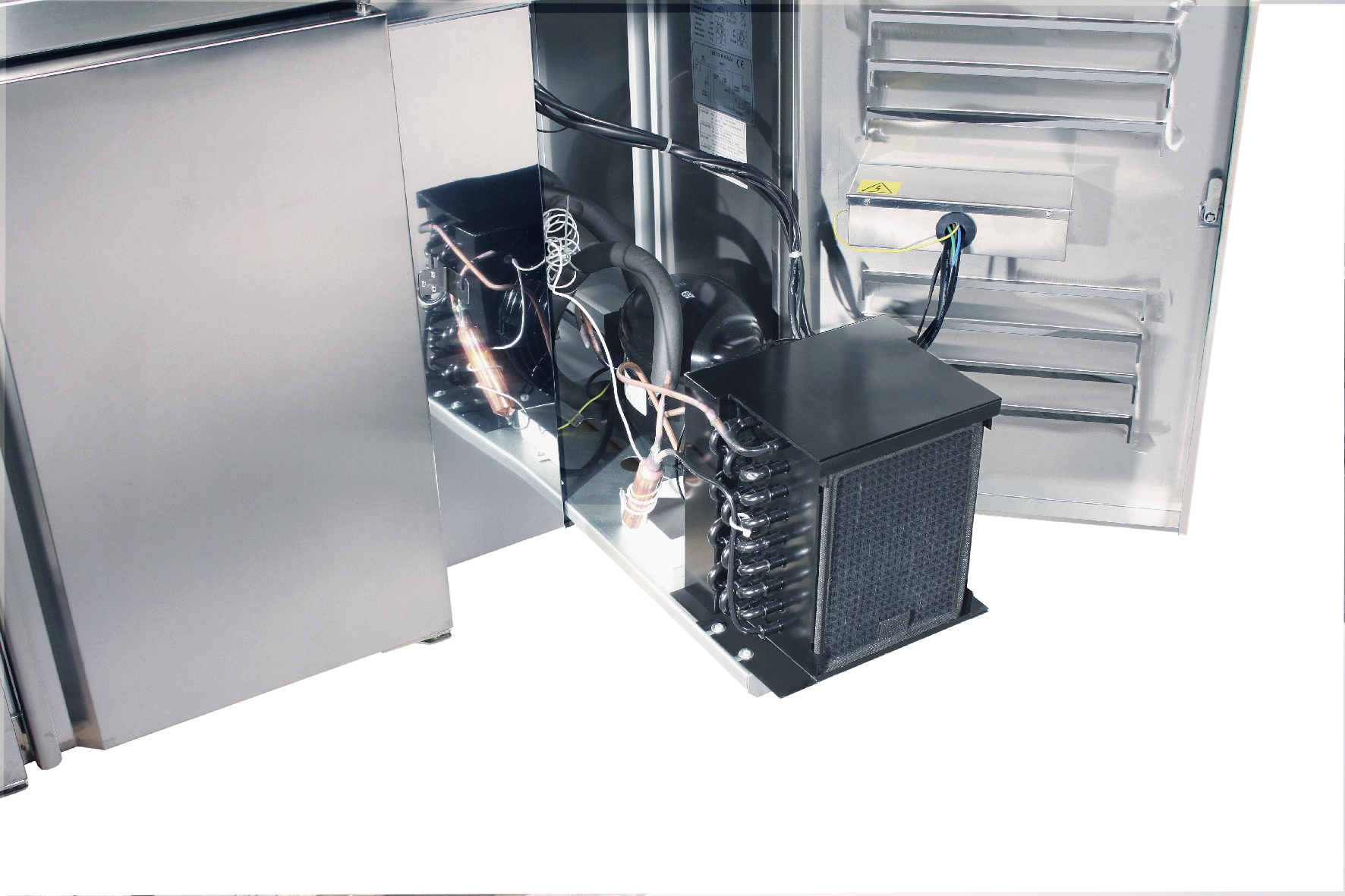 - Material: (Gehäuse und Innenraum) Edelstahl, - Türen selbstschließend, - 1 höhenverstellbares Rost und 1 Auflageschienen-Set pro Tür, - Herausziehbarer Kompressor, - Schubladen zum Selbsteinbau (separat erhältlich, siehe Seite 52), - Digitale Temperaturkontrolle (DIXELL), - Umluftkühlung, - Isolierung: 60 mm, - Automatische Abtauung, - Kältemittel: R600a, - Energieeffizienzklasse: B, - Gewicht: 132 kg, - Maße: B 1360 x L 700 x H 890-950, - temp. -2 / +8 °C, - Anschluss: 230 V - 50 Hz - 0,3 kW