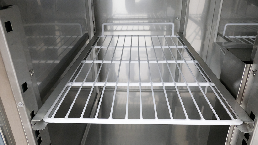 - Material: (Gehäuse und Innenraum) Edelstahl, (Arbeitsfläche) Edelstahl, - 1 höhenverstellbares Rost und 1 Auflageschienen-Set pro Tür, - Auf 3 Seiten eingeschäumter Verdampfer, - Statische Kühlung mit Umluftventilator, - Digitale Temperaturkontrolle (DIXELL), - Automatische Abtauung, - Kältemittel: R600a, - Energieeffizienzklasse: C, - Gewicht: 118 kg, - Maße: B 1365 x L 700 x H 870-890, - temp. +2 / +8 °C, - Anschluss: 230 V - 50 Hz - 0,23 kW