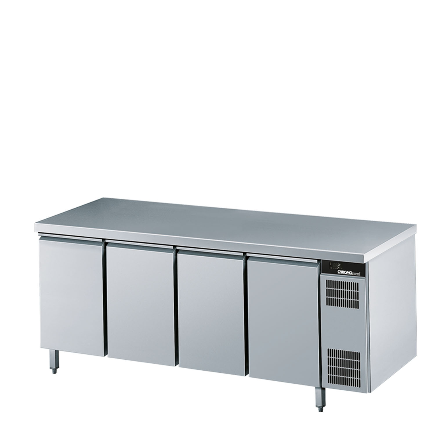 KÜHLTISCH GN 1/1, MIT TISCHPLATTE ALLSEITS AB, STECKERFERTIG. Tischplatte (50 mm) aus CNS 18/10, schalldämmend unterfüttert und mit umlaufendem Profil verstärkt. Kühlkorpus in einem Stück hochdruckgeschäumt, innen und außen aus Edelstahl. Verdampferfreier Innenraum. Steckerfertige Umluftkühlung mit unverwüstlich komplett in der Rückwand eingeschäumtem Verdampfer, automatischer Abtauung, Tauwasserverdunstung und elektronischer Regelung mit Digitalanzeige. Kältemaschine für Servicezwecke beweglich montiert. Maschinenfachblende zur einfachen Kondensatorreinigung ohne Werkzeug demontierbar. Flügeltüren und Schubladenschilder jeweils in einem Stück hochdruckgeschäumt, mit integrierter Griffleiste und leicht auswechselbarer Magnet-Dichtung. Schubladen mit Teleskopauszügen aus Edelstahl. Füße 150 mm hoch, höhenverstellbar +/- 20 mm. Je Tür 1 kippsicheres höhenverstellbares U-Auflageschienenpaar und 1 Tragrost GN 1/1 aus CNS 18/10 als Zubehör. Sockelbaufähig. Tischplatte abnehmbar. Temperaturbereich 0 / +12 °C. Anschlusswert 420 W / 230 V / 50 Hz. Kältemittel R290. Kälteleistung 346 W -15 °C VT. Energieverbrauch in 24h 2,9 kWh.