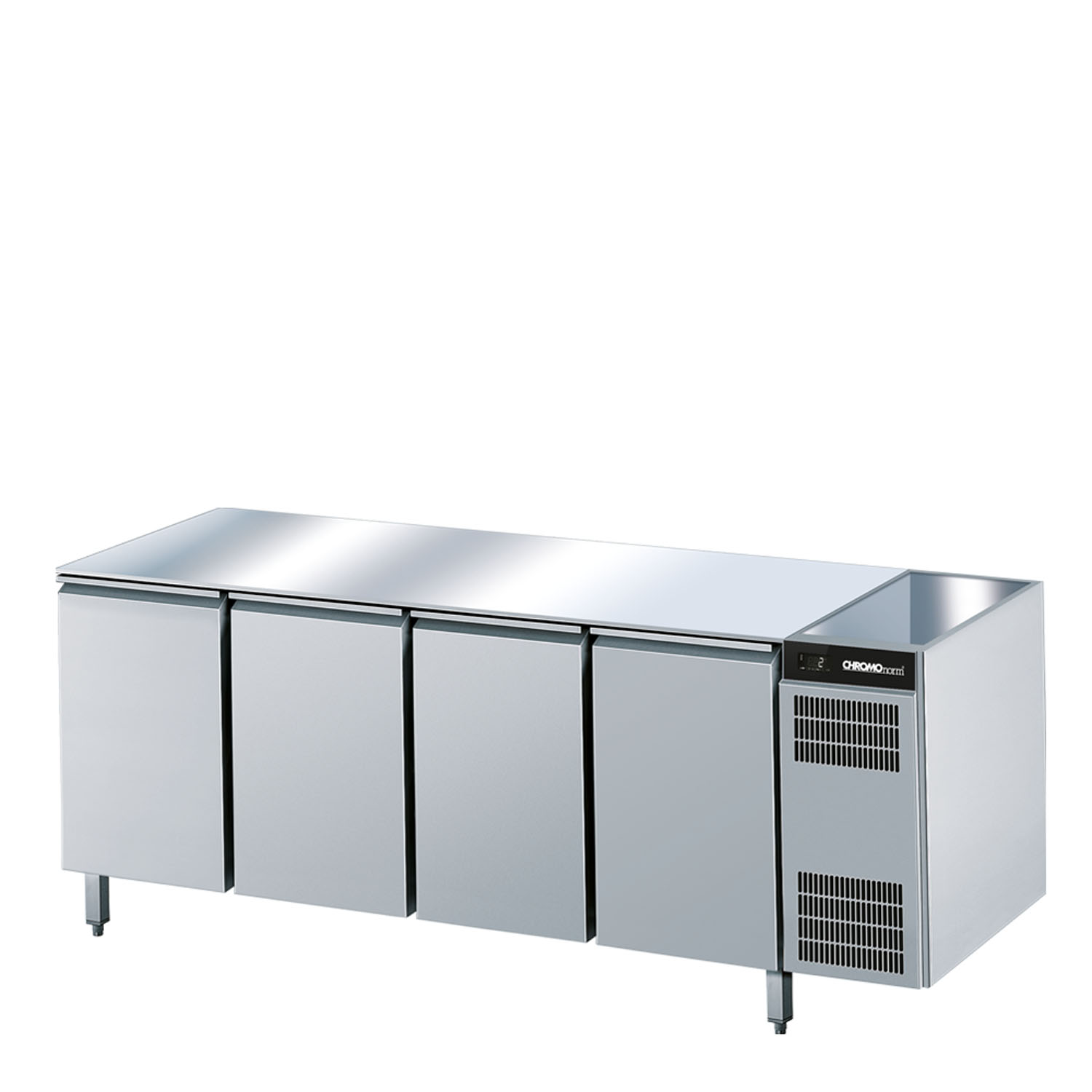 KÜHLTISCH GN 1/1, OHNE TISCHPLATTE, STECKERFERTIG. Kühlkorpus in einem Stück hochdruckgeschäumt, innen und außen aus Edelstahl. Verdampferfreier Innenraum. Steckerfertige Umluftkühlung mit unverwüstlich komplett in der Rückwand eingeschäumtem Verdampfer, automatischer Abtauung, Tauwasserverdunstung und elektronischer Regelung mit Digitalanzeige. Kältemaschine für Servicezwecke beweglich montiert. Maschinenfachblende zur einfachen Kondensatorreinigung ohne Werkzeug demontierbar. Flügeltüren und Schubladenschilder jeweils in einem Stück hochdruckgeschäumt, mit integrierter Griffleiste und leicht auswechselbarer Magnet-Dichtung. Schubladen mit Teleskopauszügen aus Edelstahl. Füße 150 mm hoch, höhenverstellbar +/- 20 mm. Je Tür 1 kippsicheres höhenverstellbares U-Auflageschienenpaar und 1 Tragrost GN 1/1 aus CNS 18/10 als Zubehör. Sockelbaufähig. Temperaturbereich 0 / +12 °C. Anschlusswert 420 W / 230 V / 50 Hz. Kältemittel R290. Kälteleistung. 346 W -15 °C VT. Energieverbrauch in 24h 2,9 kWh.