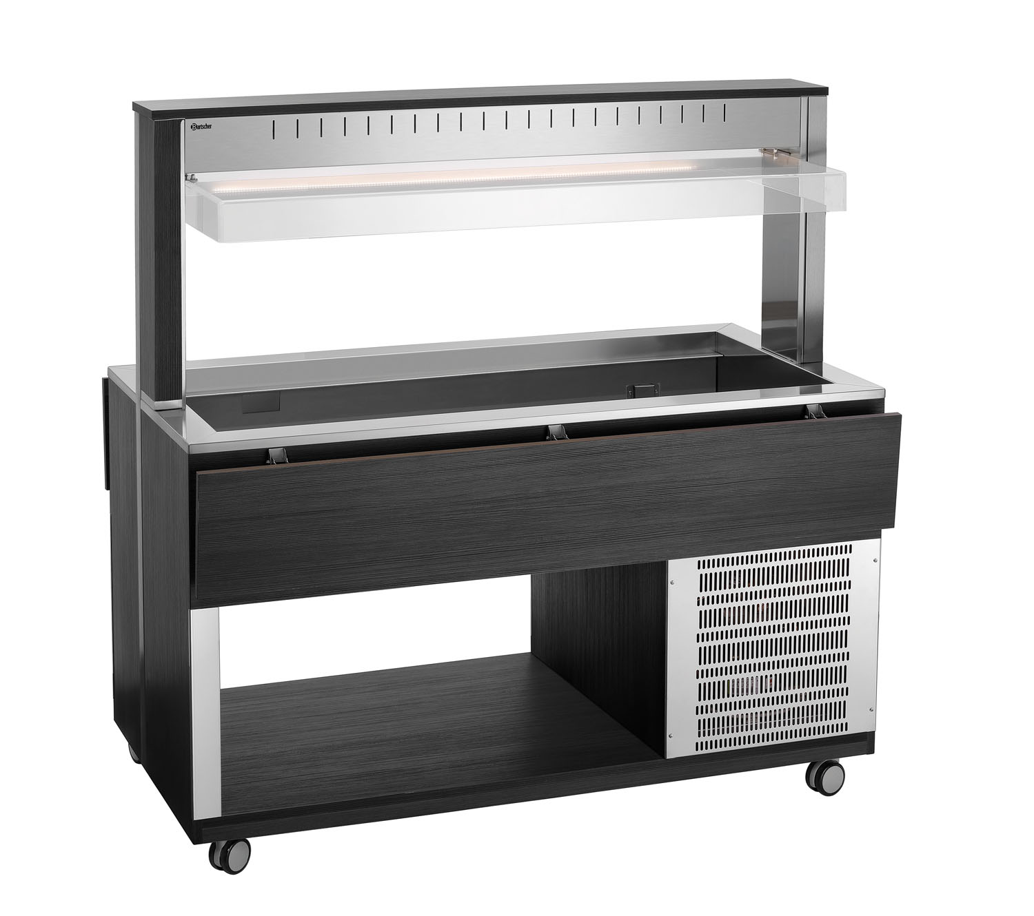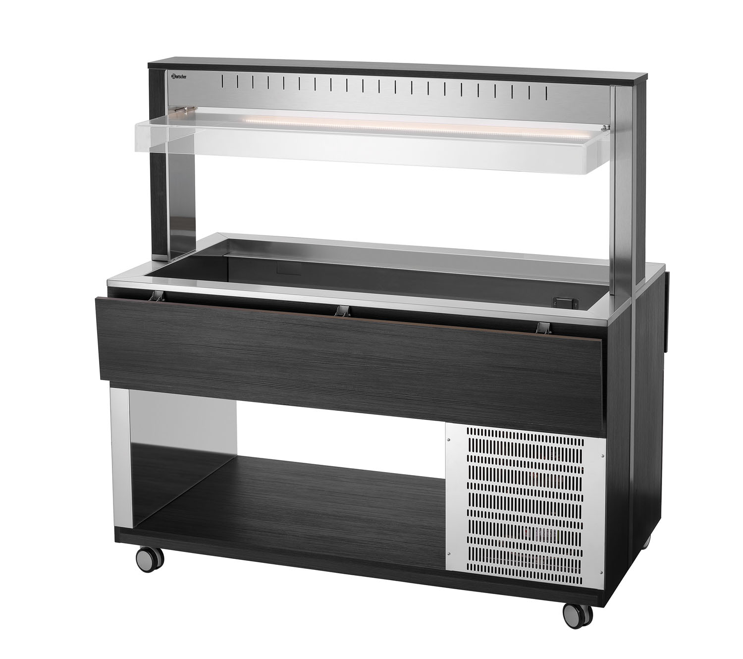 Die mobile Buffetlösung im modernen Holzdesign – Der Buffetwagen mit Hustenschutz und LED-Beleuchtung fasst 4 GN-Behälter 1/1 GN und hält Speisen zuverlässig am Buffet kalt.