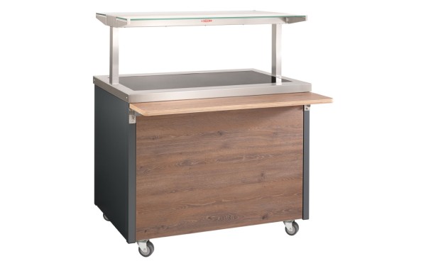Kalt-Warm-Platte für 3 x GastroNorm. (990 x 530 mm) Platte flächenbündig in die Abdeckung eingebaut. Digital regelbar von – 5 °C bis + 140 °C. Oberfläche mit schwarzer Gorilla-Glasauflage oder CNS.