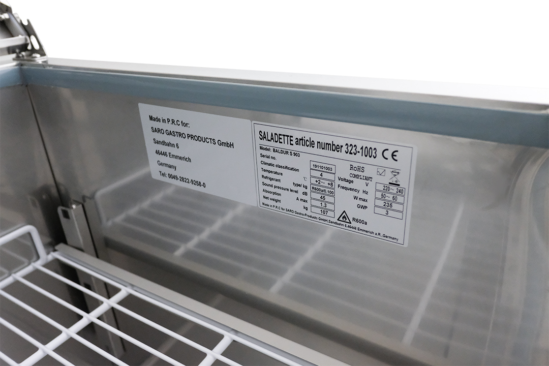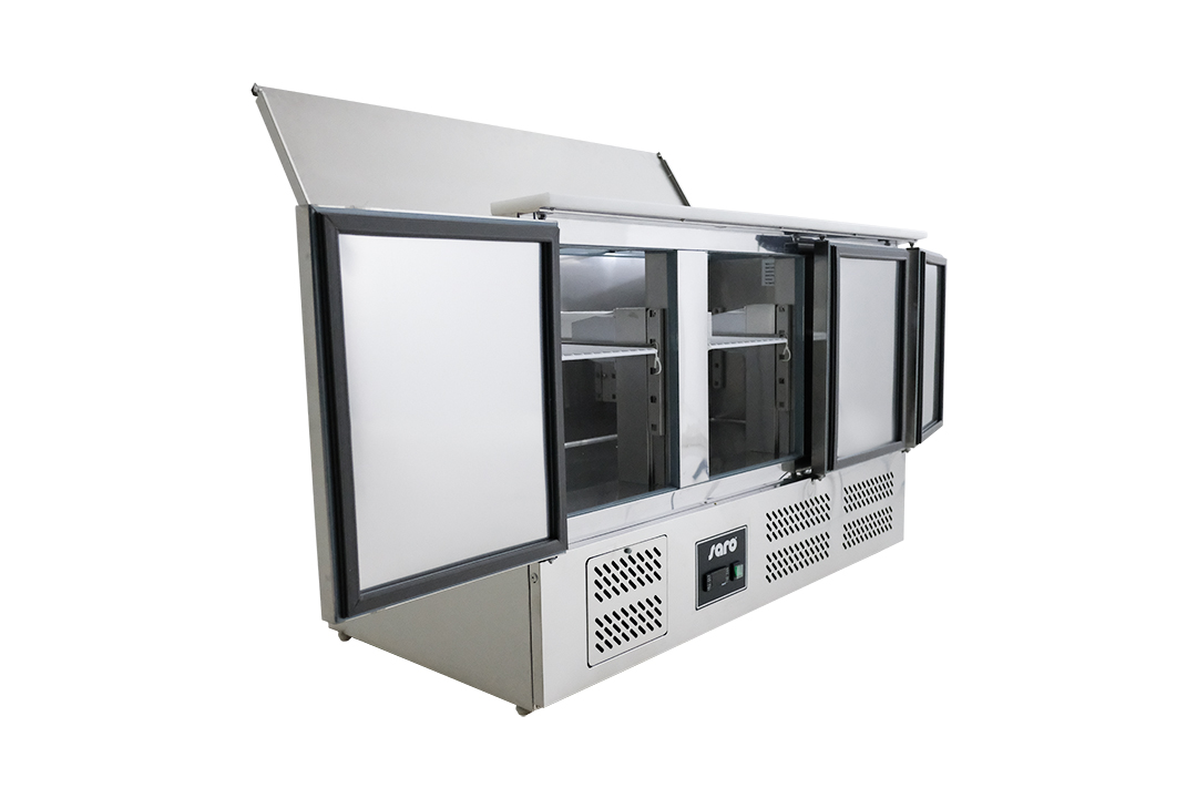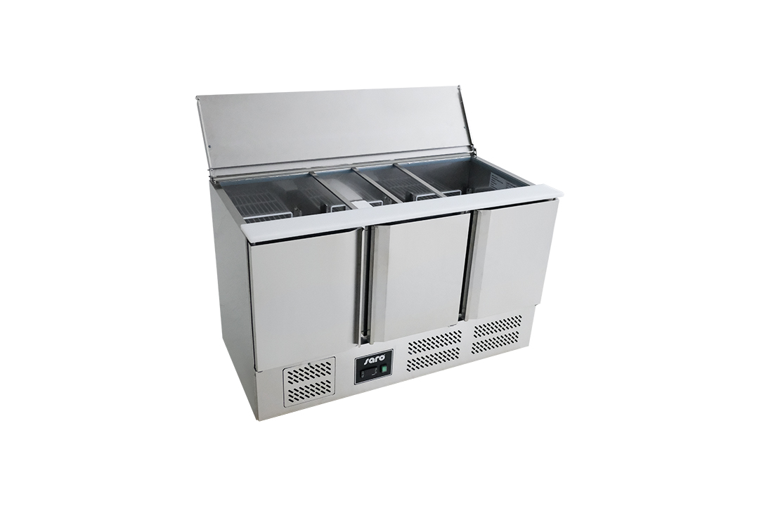 - Material: (Gehäuse und Innenraum) Edelstahl, - Teleskopschiebedeckel, - Polyethylen-Schneidebrett, - 1 höhenverstellbarer Rost und 1 Auflageschienen-Set pro Tür, - Auf 3 Seiten eingeschäumter Verdampfer, - Statische Kühlung mit Umluftventilator, - Digitale Temperaturkontrolle (DIXELL), - Automatische Abtauung, - Kältemittel: R600a, - Gewicht: 120,5 kg, - Maße: B 1365 x L 700 x H 870-890, - temp. +2 / +8 °C, - Anschluss: 230 V - 50 Hz - 0,23 kW