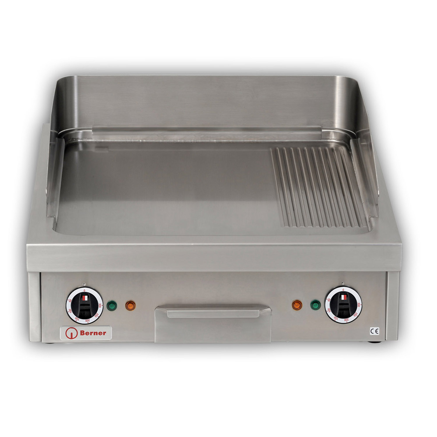 Auch mit dieser NEUEN Grillplatte, bietet die Berner Kochsysteme eine hervorragende Auftisch Bratplatte an. Die Griddleplatte BGHA60G in gerillter Ausführung, ist ein steckdosentaugliches Grundmodell mit 400 Volt Anschluß und einer Anschlußleistung von 7,5 kW. Die Bratplatte ist mit 2 separat schaltbaren Heizzonen ausgestattet und natürlich auch separat schaltbar. Die nutzbare Bratfläche beträgt 520 x 520 mm.