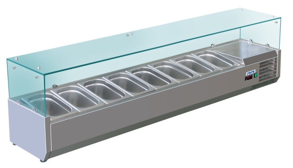 - Material: (Gehäuse) Edelstahl, - Glasaufsatz, Glasstärke 6 mm, - Höhenverstellbare Füße, - Verdampfer eingeschäumt, - Einfach zu reinigender Filter, - Ideal in Kombination mit unseren Pizzatischen, - Temperaturbereich: +2 / +8 °C, - Digitale Temperaturkontrolle (DIXELL), - 8 x 1/3 GN, - Statische Kühlung, - Kältemittel: R600a, - Gewicht: 90 kg, - Maße: B 1800 x L 395 x H 435, - temp. +2 / +8 °C, - Anschluss: 230 V - 50 Hz - 0,15 kW