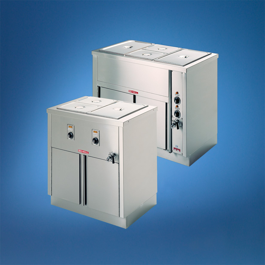 400 x 600 x 850 mm. Ausführung CNS 18/10. Auf Sockel. Wanne für GN-Einsätze 1x 1/1-200 oder deren Unterteilung, indirekt beheizt. Wasserablaßhahn 1/2". Im Unterbau 1 Wärmeschrank mit Flügeltüren, ohne Zwischenbord. Wanne und Schrankraum getrennt beheizbar. Thermostatisch regelbar. E-Anschluß: 230V/1,75kW.