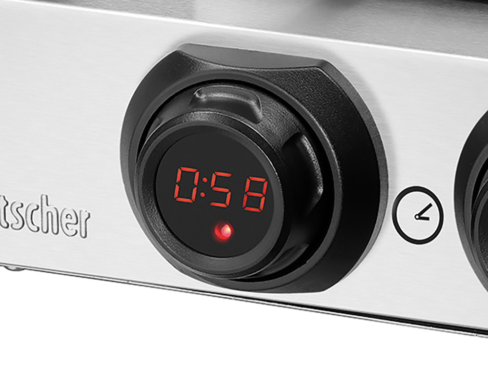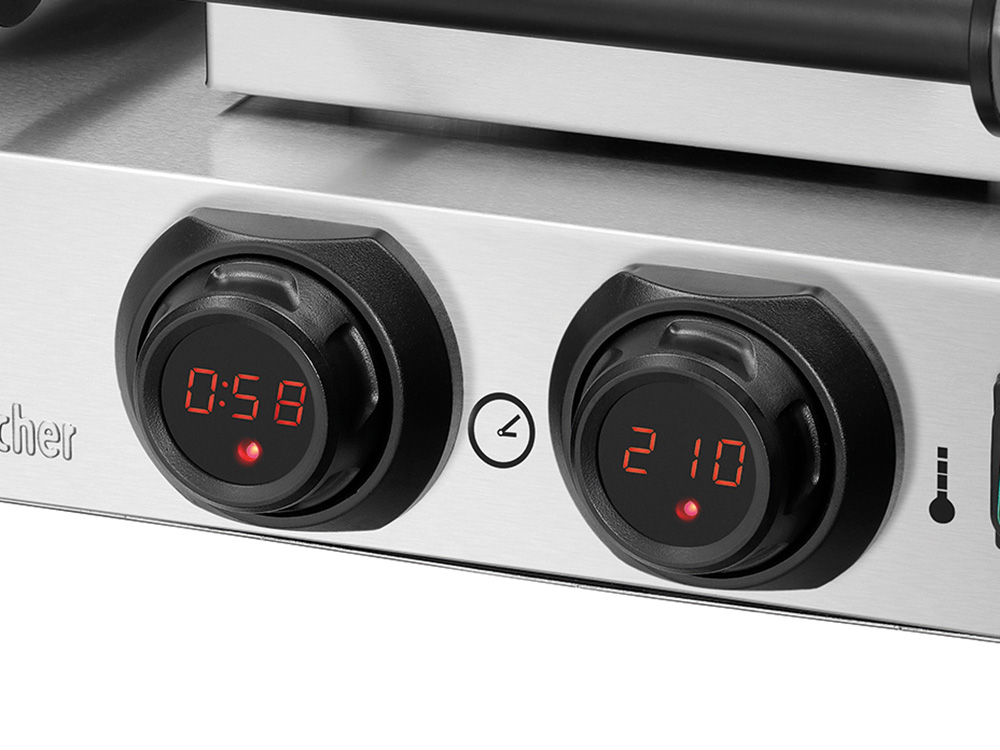 Beste Voraussetzungen für die perfekte Waffel: Eine robuste Bauweise, Leistungsstärke und eine einfache sowie intuitive Knebel-Bedienung mit Digital-Anzeige, Timer und Signalton. Zudem bieten die gusseisernen Backplatten mit Brüsseler-Waffelform eine hohe Wärmeleitfähigkeit.