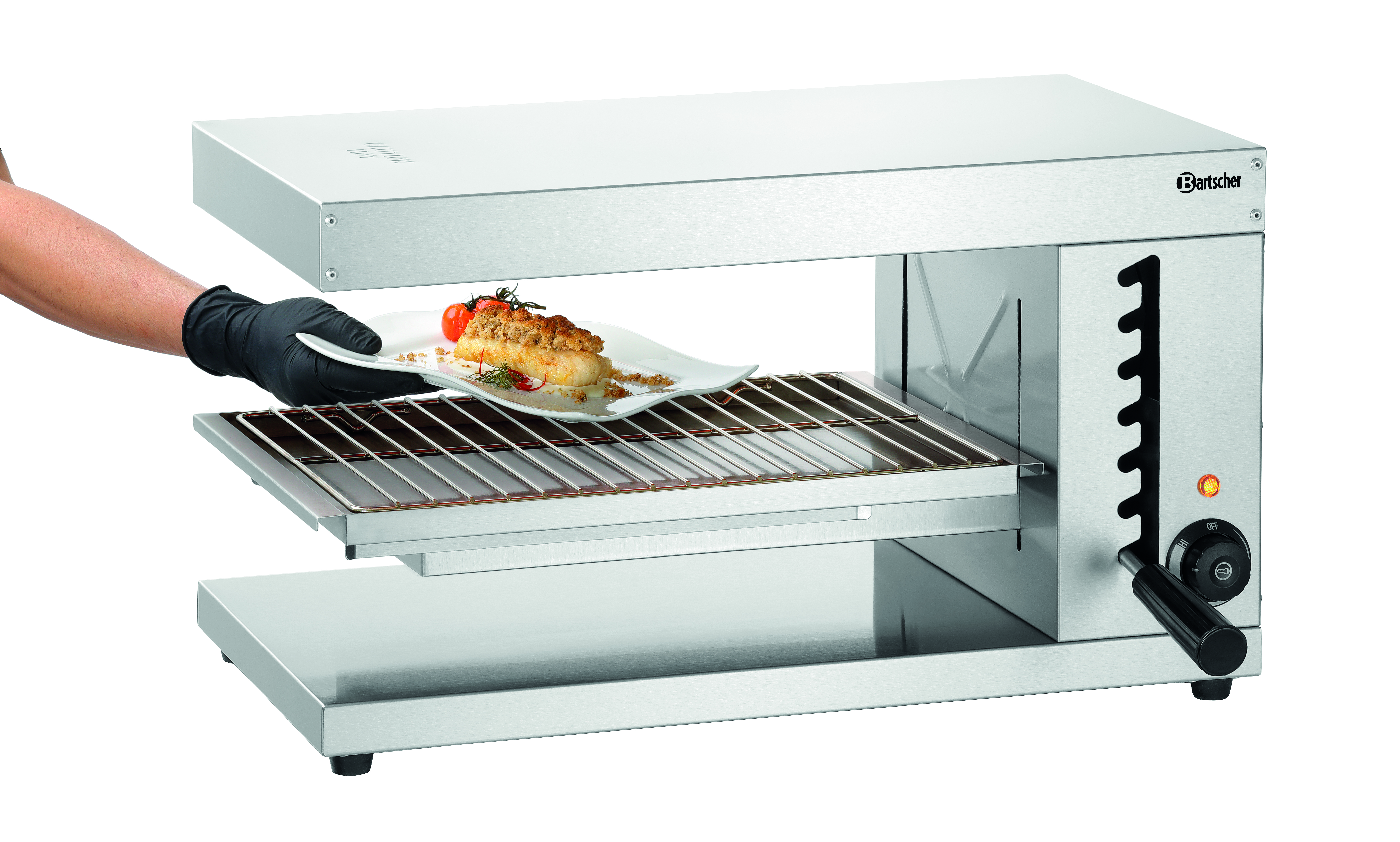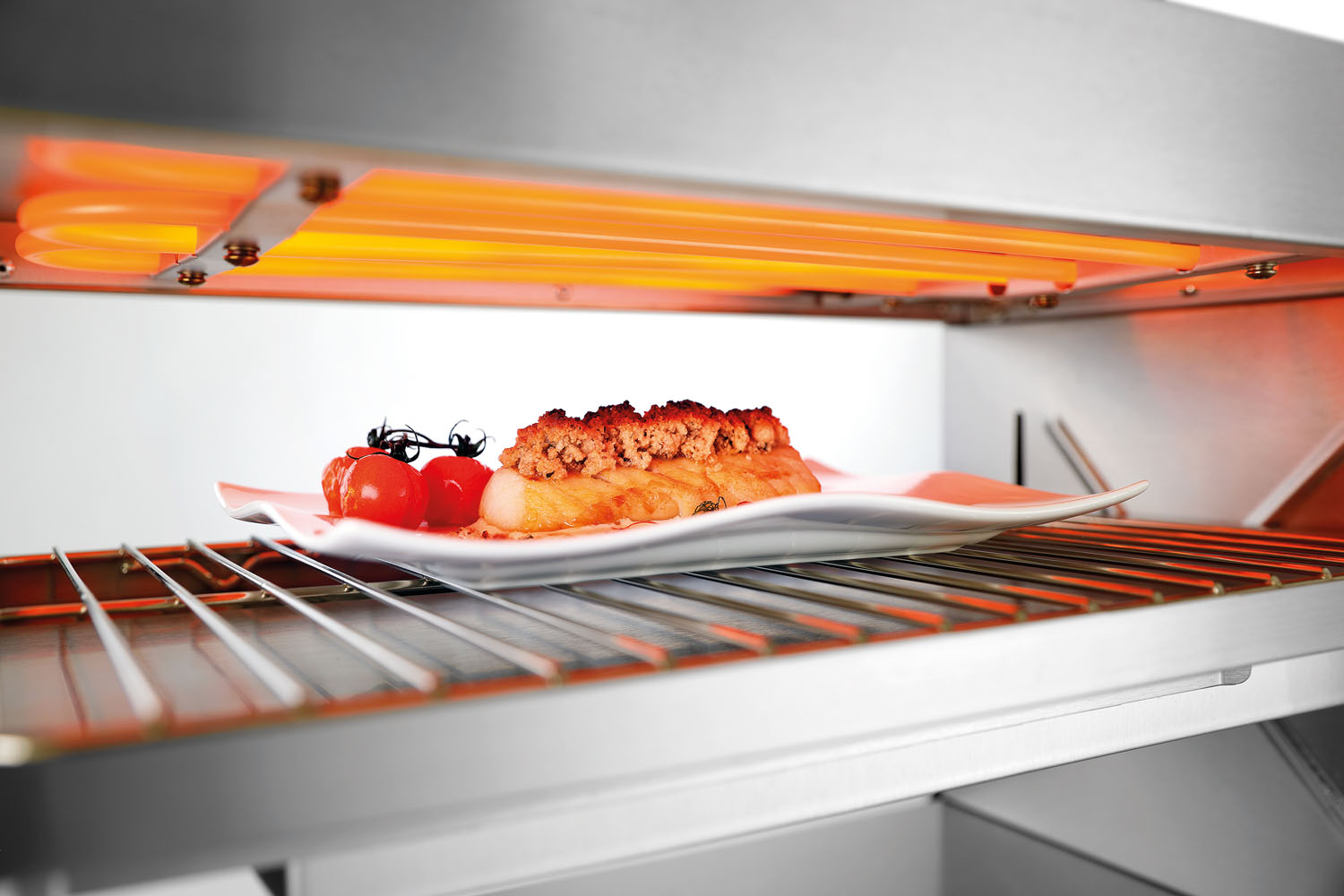 Gratinieren, überbacken und warmhalten direkt am Pass für einen fließenden Arbeitsablauf. Bei einer Platzierung auf einem Arbeitstisch bieten die beiden langen offenen Seiten des Salamanders eine praktische beidseitige Bedienung innerhalb der Küche oder zum Servicebereich.
