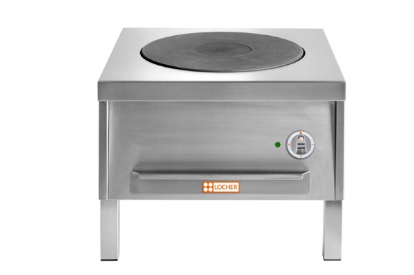 Gehäuse Ausführung in CNS 18/10 - 1 Guss-Kochplatte Ø 400 mm - Hauptschalter (3-Leistungsstufen) mit Betriebsanzeige - Überhitzungsschutz - Schmutzschublade zur leichten Reinigung - Füße höhenverstellbar - Im Lieferumfang enthalten: Zuleitung mit CEE-Stecker