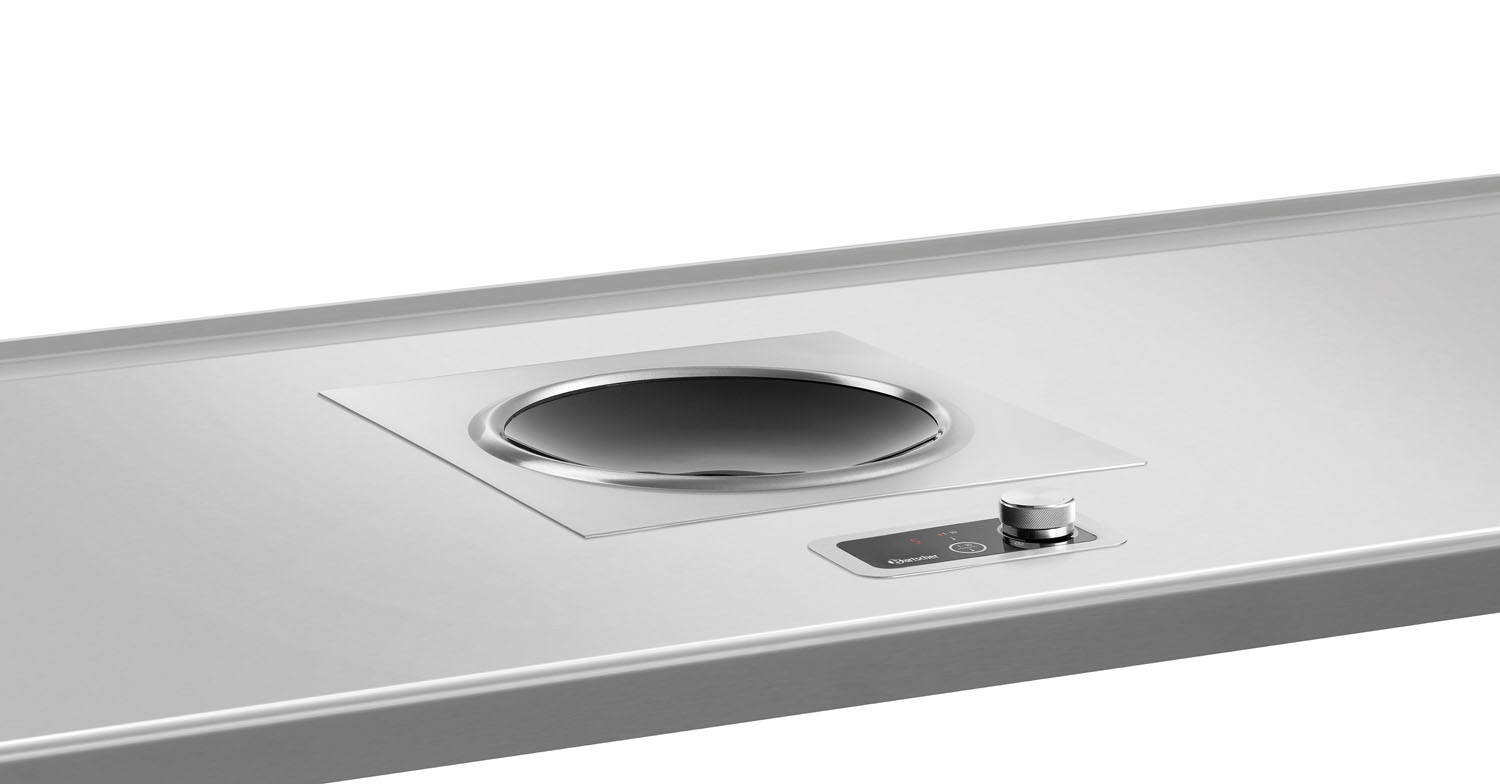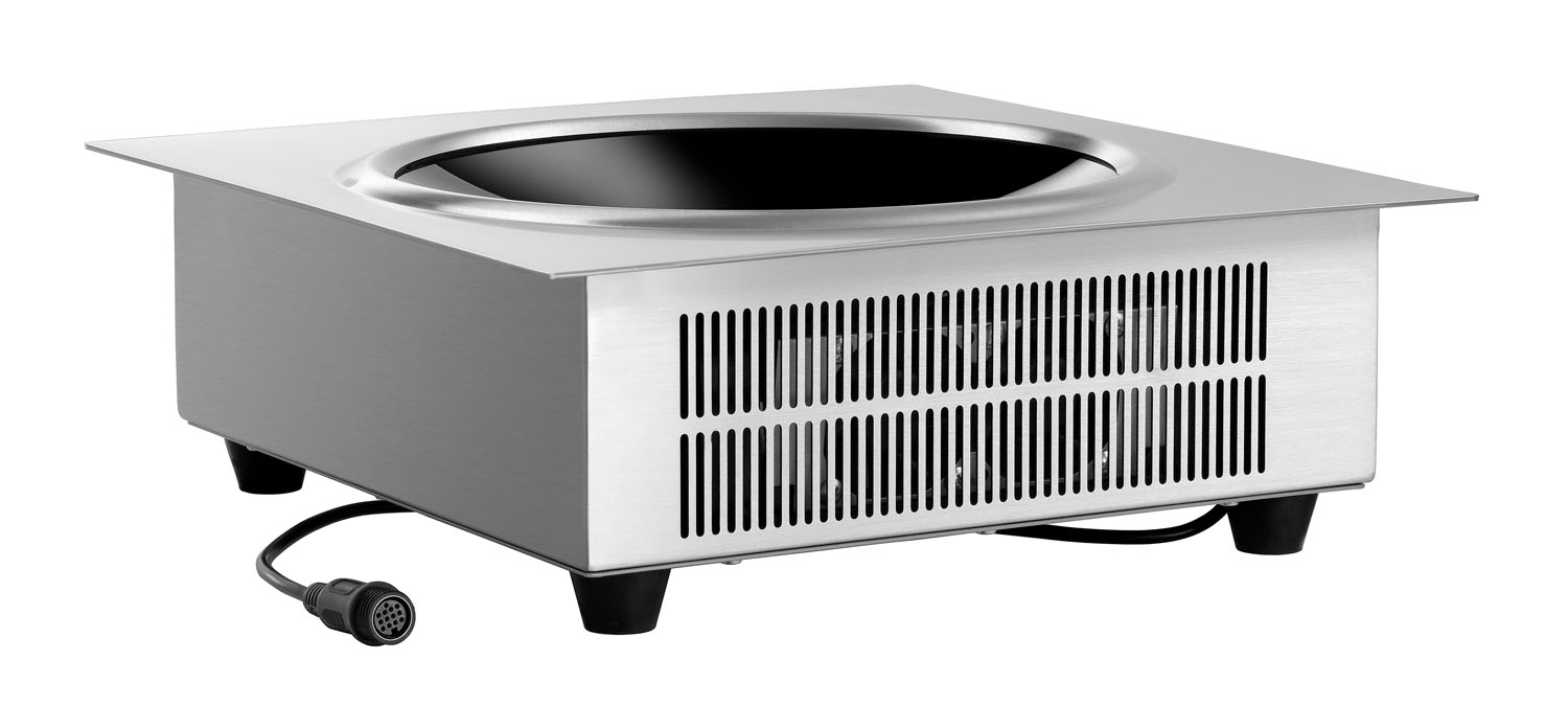 Der Einbau-Induktionswok lässt sich in Tisch- und Arbeitsplatten integrieren und bietet damit eine optimale Arbeitshöhe. Das separate Bedienfeld ermöglicht eine stufenlose Reglung von 60 bis 240 °C. Alternativ stehen 10 Leistungsstufen zur Wahl.