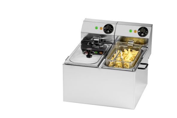 - Material: Edelstahl, - Abgerundetes, herausnehmbares Becken mit Kältezone, - Stufenlose Temperatureinstellung, - Herausnehmbare Heizelemente ermöglichen eine Problemlose Reinigung, - Sicherheitsthermostat, - Abmessungen inkl. Seitengriffe, - Gewicht: 8 kg, - Maße: B 435 x L 430 x H 310, - Inhalt: 2x 4 Liter, - temp. 0 / +180 °C, - Anschluss: 230 V - 50 Hz -2 x 2 kW