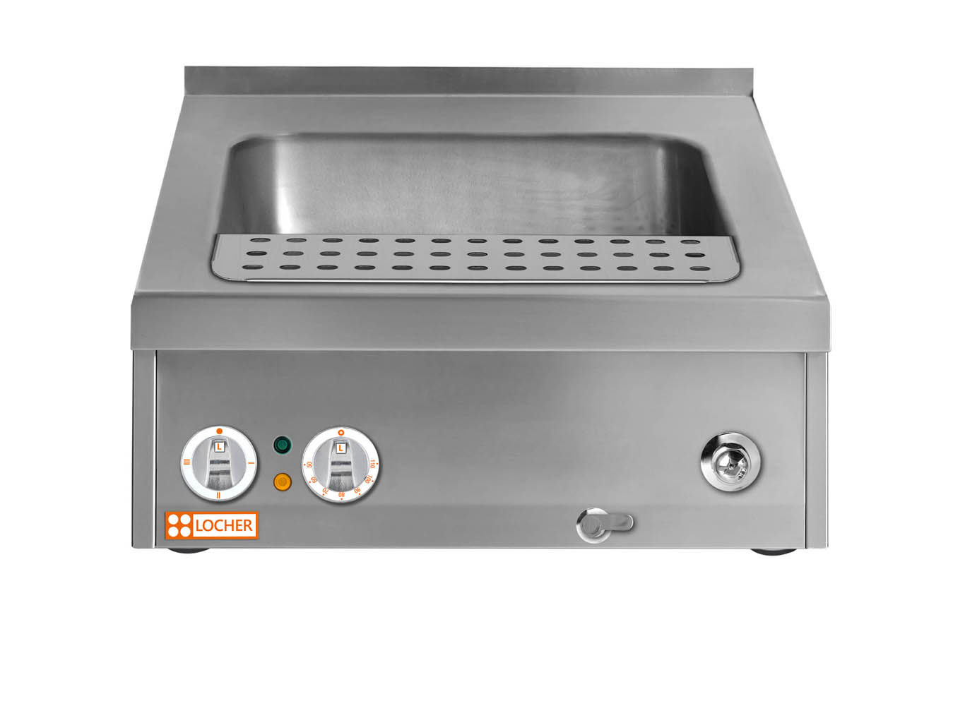 Der LOCHER Elektro-Tisch-Nudelkocher GN 1/1 - quer hat einen Gesamtanschluß von satten 7000 Watt ( Art.Nr.: 216601 ). Etwas andere Bezeichnungen für dieses Gerät sind auch Universalkocher oder auch Kochmarie, das ist zum Beispiel die Bezeichnung von MKN. Der Auftisch-Nudelkocher wird indirekt beheizt. Indirekt bedeutet, dass sich in dem Kochbecken keine Heizung befindet. Die Heizung befindet sich an der Beckboden-Unterseite. Der Nudelkocher verfügt über einen Hauptschalter der 3-Leistungsstufen schalten kann. Die Temperaturregulierung erfolgt stufenlos über Thermostat. Im Vergleich zu anderen Nudelkocher, hat dieses Modell keinen separaten Wasserhahn um das Wasser zu entsorgen. Grund dafür ist, dass diese Ausführung über einen Festanschluß mit automatischem Wasserzu- und Ablauf verfügt. Also , das ist doch wirkliche nicht mehr zu toppen, schöner und einfacher kann das Arbeiten doch gar nicht mehr sein. Alternativ erhalten Sie in der FLEX 600 Serie die gleiche Ausführung auch noch in der Größe GN 2/3 ( Art.Nr.: 216600 ). Und ohne Festwasseranschluß steht Ihnen noch das Modell in der Größe GN 1/1 zur Verfügung mit der Art.Nr.: 216675.