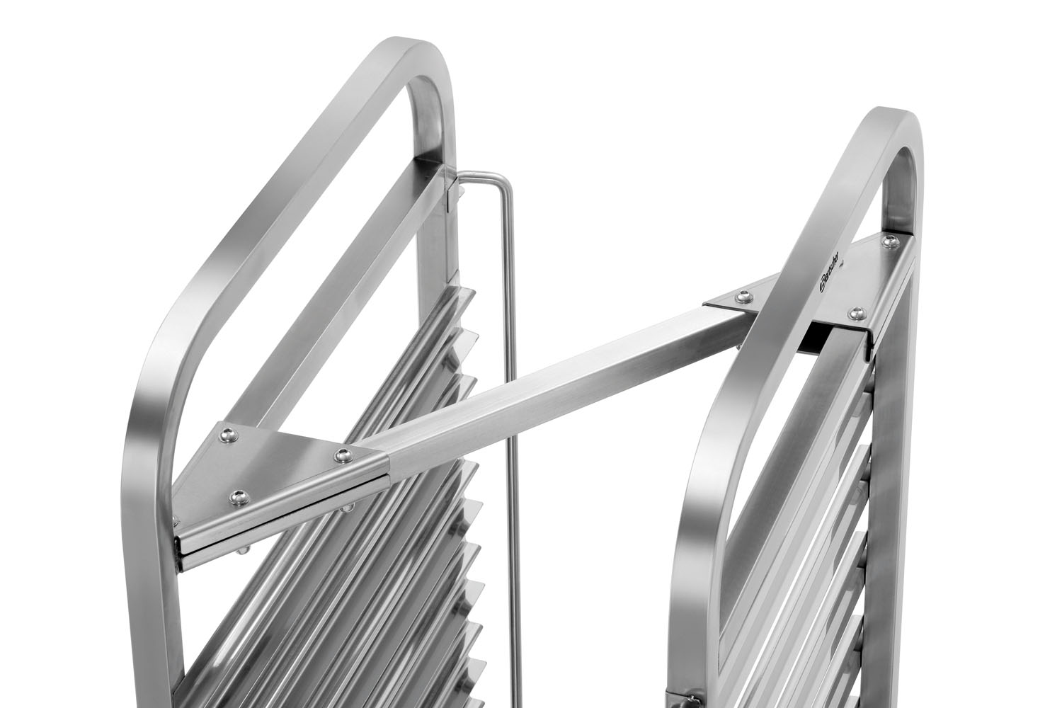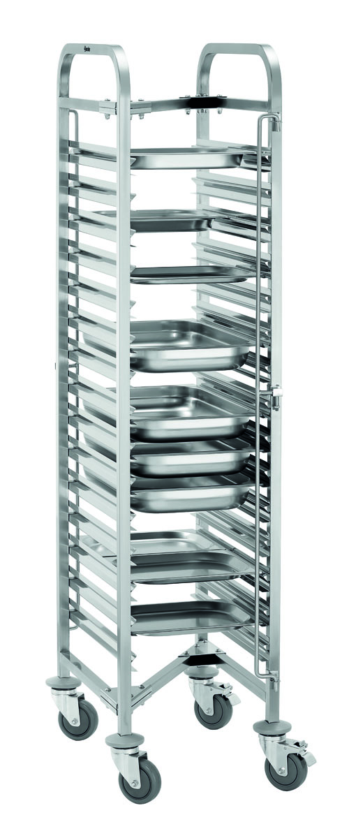 Gastronormwagen mit 15 Einschüben im GN-Format und einer maximalen Tragfähigkeit von 150 kg. Die besondere Bauweise ermöglicht ein ineinanderschieben von 2 oder mehr Gastronormwagen AGN1500-1/1 und somit eine platzsparende Lagerung.