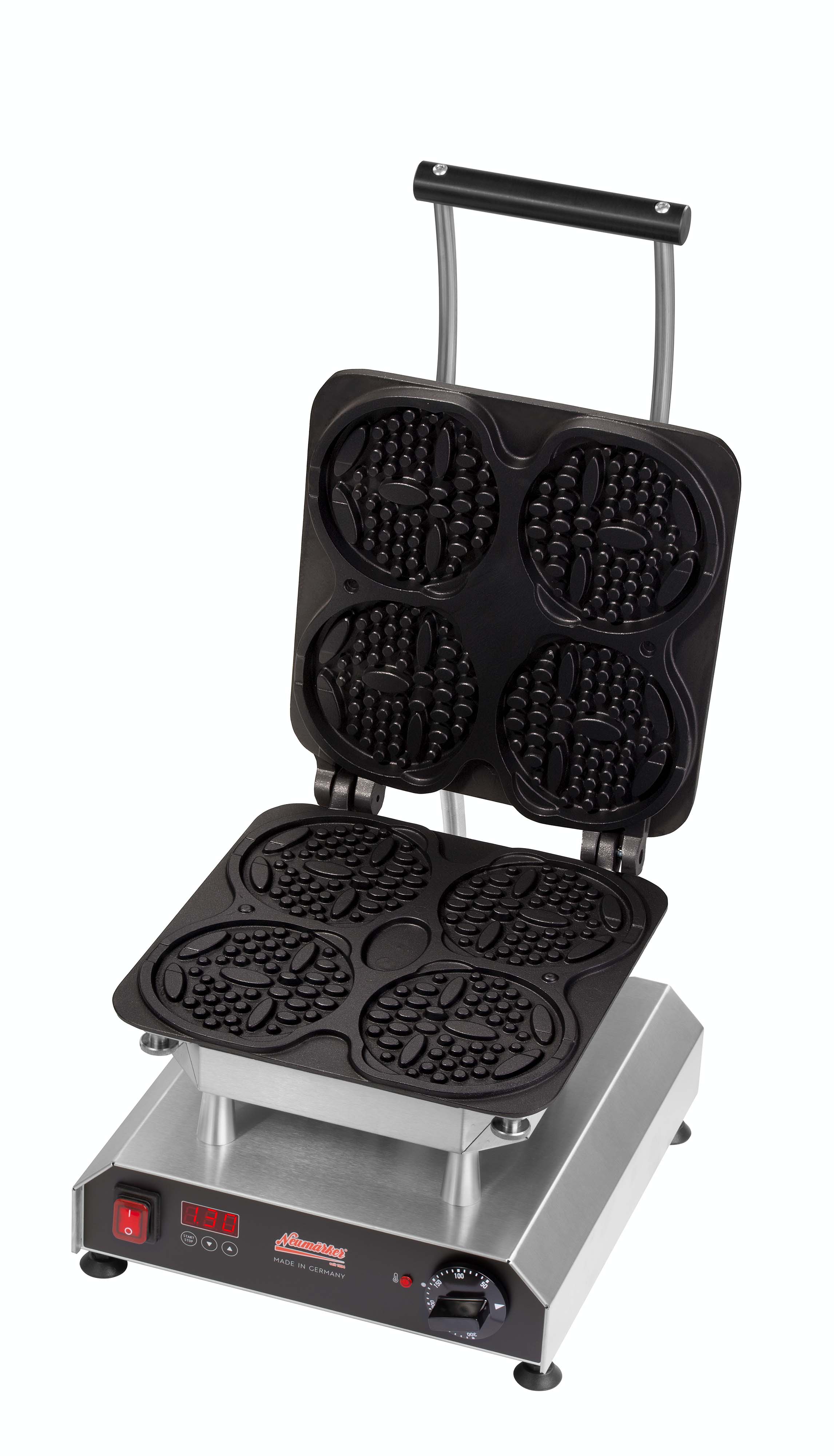 Die runden Teddygesichter lassen sich großartig dekorieren und benötigen nur kurze Backzeiten. Ideal für Kinderfeste. • Multifunktionsgerät für auswechselbare Platten (Waffel-Bärchen am Stiel Wechselplatten im Lieferumfang enthalten) • Aktuell über 25 verschiedene Wechselplatten erhältlich, z.B. für Waffeln, Pizza, Crêpes, Paninis, Pancakes, Donuts, Sandwiches, Churros u.v.m • Digitaltimer mit großem Display einstellbar bis 9:59 Min/Sek • Ein Signalton am Ende der Zubereitungszeit gewährleistet beständige Produktqualität, auch bei wechselndem Personal • Durch das akustische Signal wird der Anwender zum richtigen Zeitpunkt daran erinnert, die Speisen zu entnehmen, so dass diese nicht anbrennen, während er parallel anderen Tätigkeiten nachkommt • Optimale Hitzeübertragung: Direkter Kontakt zwischen Heizkörper zur Wechselplatte durch 8 Schrauben, die gleichmäßig angezogen werden • Neue, leistungsstärkere Spezialheizkörper mit vergrößerter Heizfläche für eine gleichmäßige Wärmeübertragung ohne Hotspots • Besonders energieeffizient durch optimierte Wärmeisolierung: Eine doppelte Abschirmung minimiert Wärmeverluste und reduziert die Gefahr schwerer Verbrennungen • Äußerst stabile Rahmenkostruktion durch verstärkte Stützleisten • Der Abstand von 42 mm zwischen den heißen Platten und dem Gehäuse ermöglicht die thermische Entkopplung und verlängert somit die Lebenszeit des Produktes • Verbesserte Lüftungsschlitze gewährleisten den Wärmeaustausch im Gehäuse • Einfache Reinigung der leicht erreichbaren Oberflächen • Besonders servicefreundliche Konstruktion für eine einfache Wartung und Reparatur • Frontpanel mit Display aus pflegeleichtem und langlebigem Autotex Polyester • Thermostatische Regelung 0 - 300°C • Kontrollleuchte • Ein-/Ausschalter • Gehäuse Edelstahl • Höhenverstellbare Füße • Wechselplatten: Für 4 Waffeln je 120 x 120 x 18 mm. Massiver Aluminiumguss mit Antihaftbeschichtung. Nicht geeignet für Thermocook Twin.