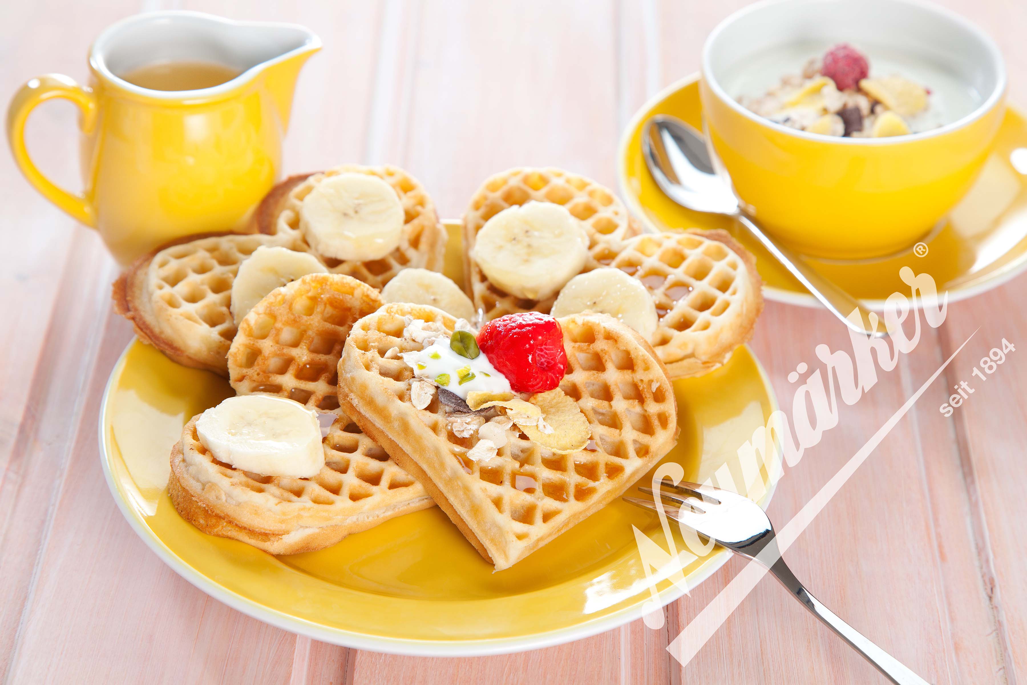 Die Sunny Waffel ist eine Neuerfindung der traditionellen Bergischen Waffel, auch als Herzwaffel bekannt. Die moderne Form mit 4 Teilstücken hat besonders formschöne Herzen und durch das feine quadratische Muster gelingt sie knuspriger, als das klassische Vorbild. Die Sunny Waffel hat eine einzigartige Form, bewahrt dabei aber die Ästhetik der traditionellen, deutschen Herzwaffeln. • Multifunktionsgerät für auswechselbare Platten (Sunny Waffel Wechselplatten im Lieferumfang enthalten) • Aktuell über 25 verschiedene Wechselplatten erhältlich, z.B. für Waffeln, Pizza, Crêpes, Paninis, Pancakes, Donuts, Sandwiches, Churros u.v.m • Digitaltimer mit großem Display einstellbar bis 9:59 Min/Sek • Ein Signalton am Ende der Zubereitungszeit gewährleistet beständige Produktqualität, auch bei wechselndem Personal • Durch das akustische Signal wird der Anwender zum richtigen Zeitpunkt daran erinnert, die Speisen zu entnehmen, so dass diese nicht anbrennen, während er parallel anderen Tätigkeiten nachkommt • Optimale Hitzeübertragung: Direkter Kontakt zwischen Heizkörper zur Wechselplatte durch 8 Schrauben, die gleichmäßig angezogen werden • Neue, leistungsstärkere Spezialheizkörper mit vergrößerter Heizfläche für eine gleichmäßige Wärmeübertragung ohne Hotspots • Besonders energieeffizient durch optimierte Wärmeisolierung: Eine doppelte Abschirmung minimiert Wärmeverluste und reduziert die Gefahr schwerer Verbrennungen • Äußerst stabile Rahmenkostruktion durch verstärkte Stützleisten • Der Abstand von 42 mm zwischen den heißen Platten und dem Gehäuse ermöglicht die thermische Entkopplung und verlängert somit die Lebenszeit des Produktes • Verbesserte Lüftungsschlitze gewährleisten den Wärmeaustausch im Gehäuse • Einfache Reinigung der leicht erreichbaren Oberflächen • Besonders servicefreundliche Konstruktion für eine einfache Wartung und Reparatur • Frontpanel mit Display aus pflegeleichtem und langlebigem Autotex Polyester • Thermostatische Regelung 0 - 300°C • Kontrollleuchte • Ein-/Ausschalter • Gehäuse Edelstahl • Höhenverstellbare Füße • Wechselplatten: Für 1 Waffel à 195 x 195 x 20 mm. Massiver Aluminiumguss mit Antihaftbeschichtung.