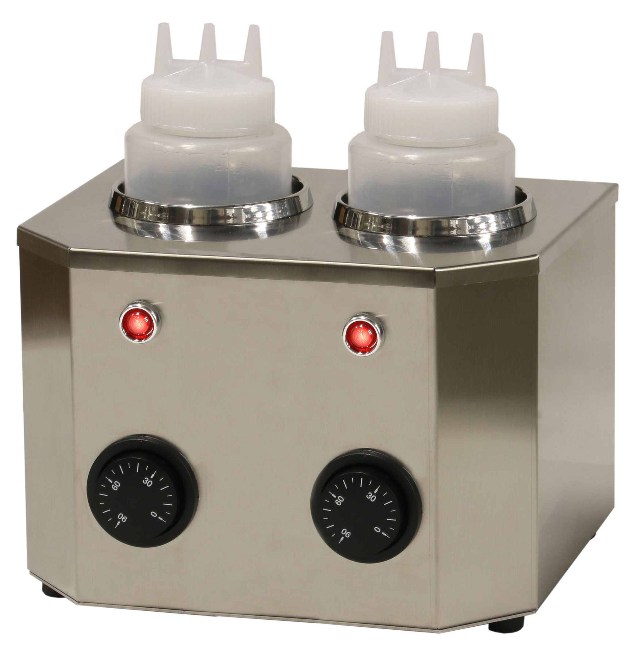 Schnell und gleichmäßig Schokoladensoße und andere süße Soßen verteilen • Zum Warmhalten von Nuss-Nougat-Creme und anderen Toppings wie z.B. Vanille- oder Karamellsoße • Einfaches Dosieren und Verteilen der warmen Schoko-Creme durch befüllbare 1-Liter-Spezialflasche mit 3 Ausgießern • Ideal für Crêpes, Waffeln, Eiscreme und viele andere Süßspeisen • Auch zum Warmhalten würziger Soßen • Gehäuse Edelstahl • Ein-/Ausschalter • Trockenbeheizt • Temperaturbereich bis 60°C • inkl. Flaschen