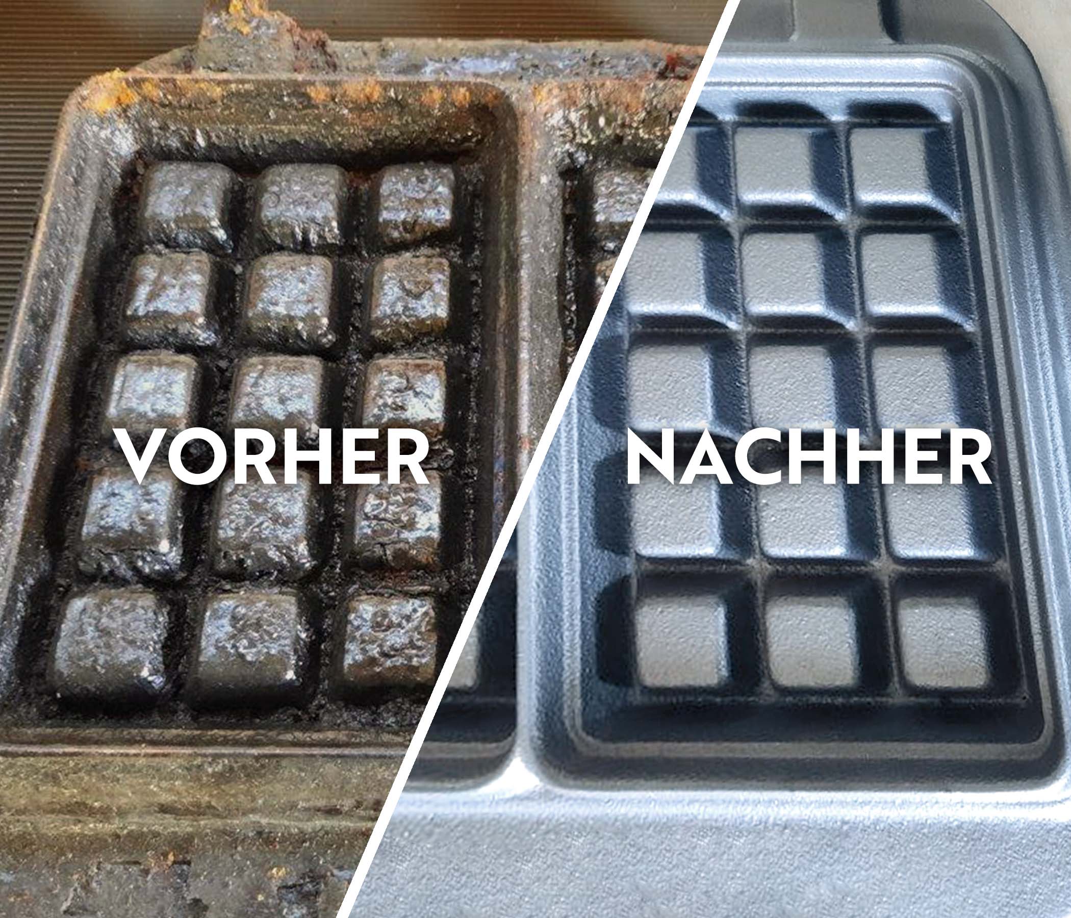 - Sämtliche Rückstände werden entfernt (z.B. Rost, eingebrannte Zuckerreste, Verkrustungen, Fettreste, Teigrückstände). Es bleibt lediglich das blanke Metall zurück.