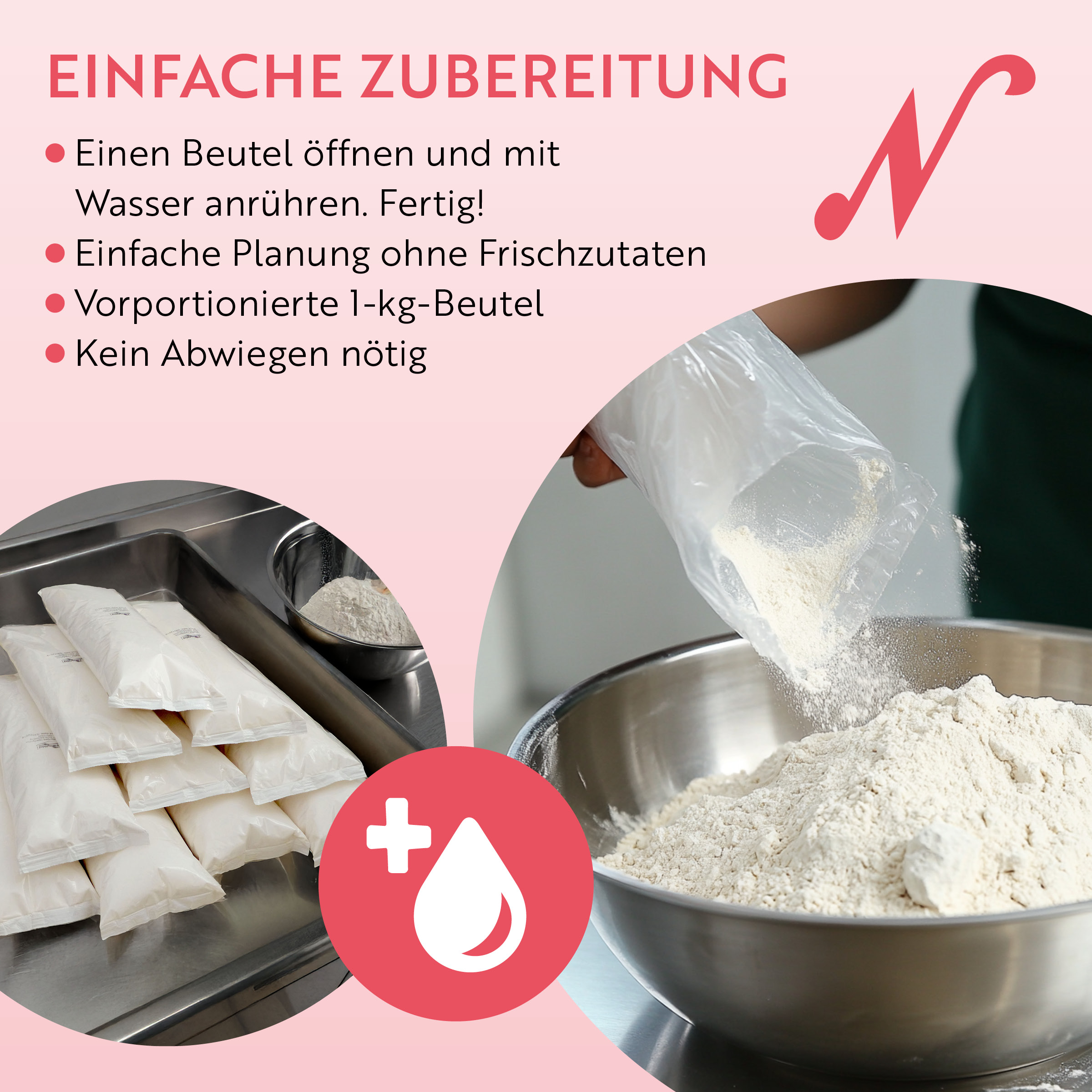 - Nur mit Wasser anrühren. Keine Zugabe von frischen Zutaten. Das geht schnell und vereinfacht die Organisation, Lagerung und Zubereitung.