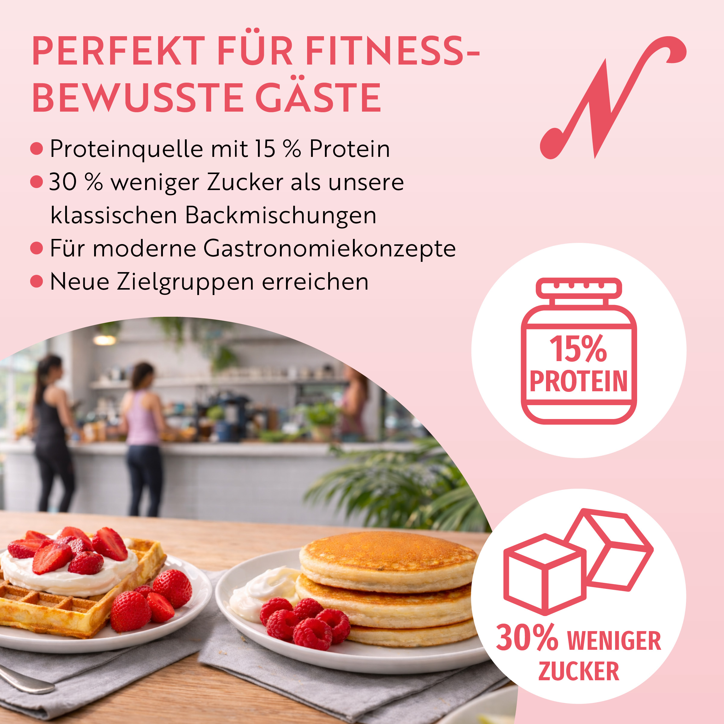 Der ideale Mix für moderne Gastronomiekonzepte: Proteinreich, zuckerreduziert und schnell zubereitet. Als Proteinquelle mit 15% Protein und 30% weniger Zucker als unsere klassischen Backmischungen spricht er gesundheits- und fitnessbewusste Gäste an. Nur mit Wasser anrühren: Fertig für Waffeln oder Pancakes, die gut schmecken und perfekt in einen aktiven Lifestyle passen.