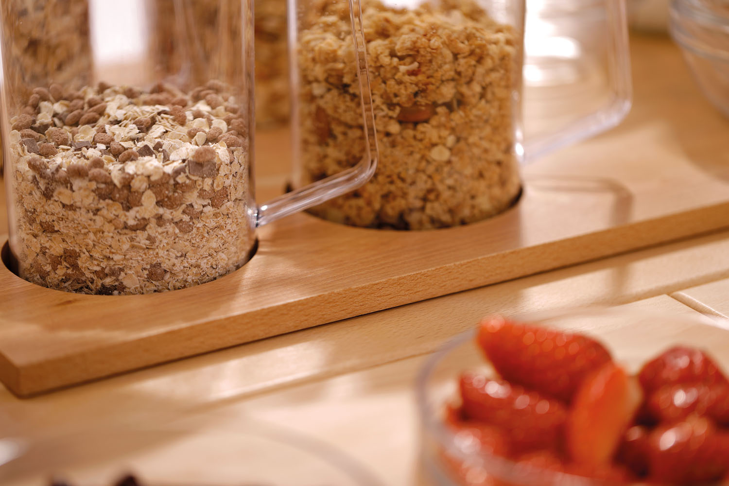 Mit dem modularen Set im schlichten Holzdesign wirkt jedes Buffet ansprechend strukturiert und aufgeräumt. Ob bei Frühstück-Buffets oder Brunchs können die 4 Karaffen mit verschiedensten Cerealien bestückt und auch ganz einfach ausgetauscht oder nachgefüllt werden. Die praktische Abstellfläche bietet Platz für beispielsweise Müsli-Schälchen.