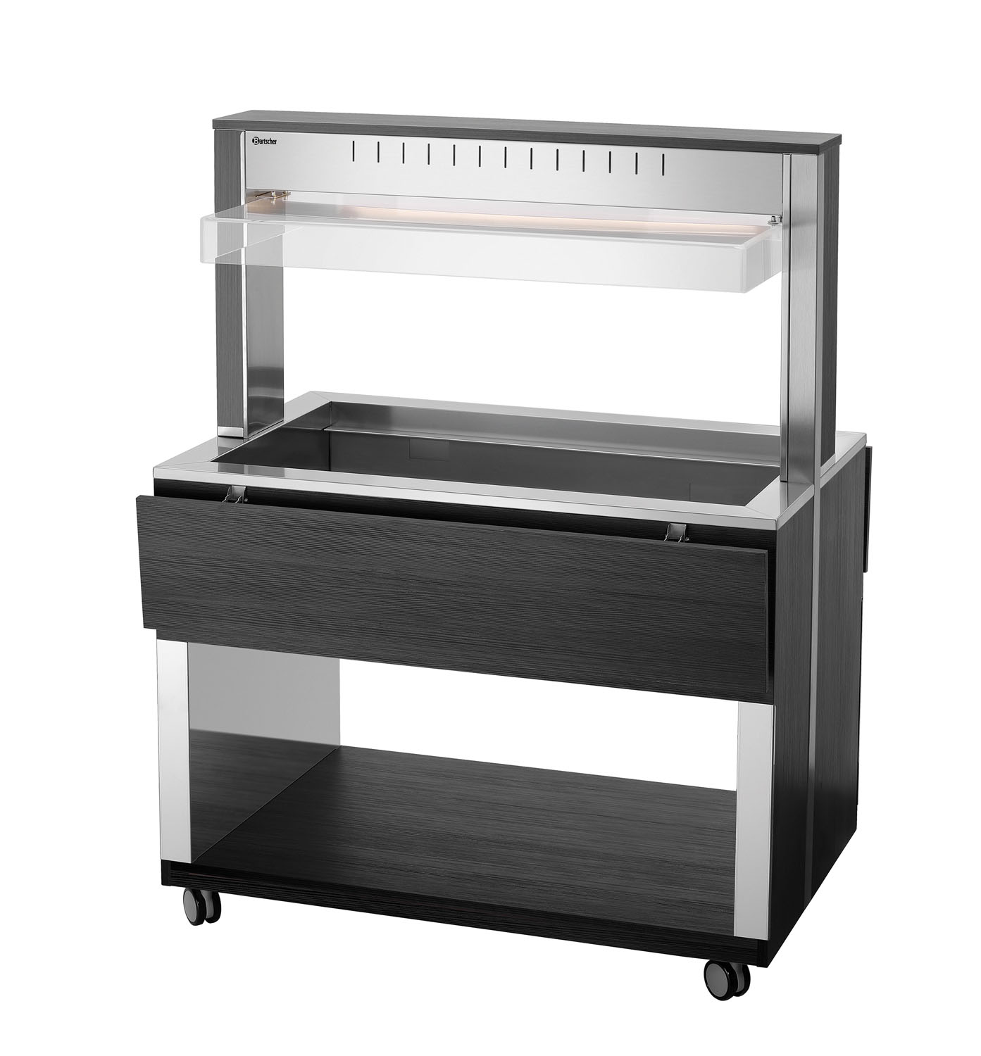 Die mobile Buffetlösung im modernen Holzdesign – Der Buffetwagen mit Hustenschutz und LED-Beleuchtung fasst 3 GN-Behälter 1/1 GN und hält mit dem Wasserbad-Prinzip Speisen schonend und ansprechend am Buffet warm.