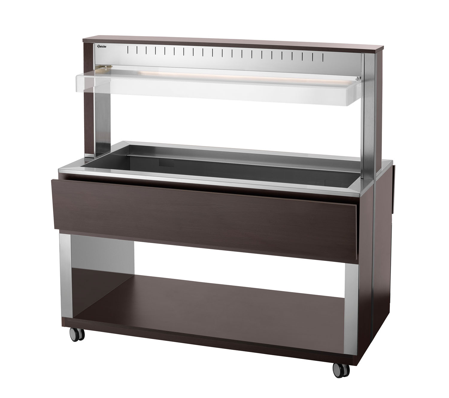 Die mobile Buffetlösung im modernen Holzdesign – Der Buffetwagen mit Hustenschutz und LED-Beleuchtung fasst 4 GN-Behälter 1/1 GN und hält mit dem Wasserbad-Prinzip Speisen schonend und ansprechend am Buffet warm.