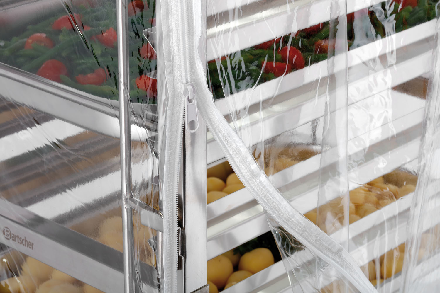 Die zum Gastronormwagen AGN1800-1/1 passende transparente Abdeckhaube schützt bei Transport und Lagerung vor Staub und Unreinheiten – sogar in Kühlräumen. Die Reißverschlüsse ermöglichen ein unkompliziertes Bestücken des Wagens auch mit aufgezogener Haube.