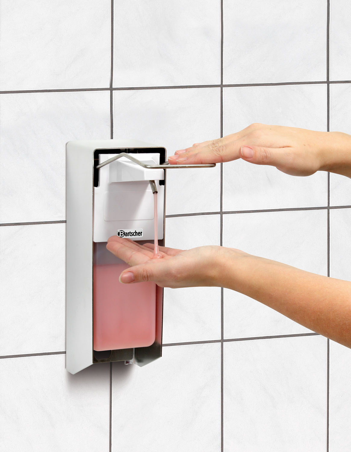 Für eine hygienische Entnahme handelsüblicher Flüssigseifen durch Einhand- oder Ellbogenbedienung