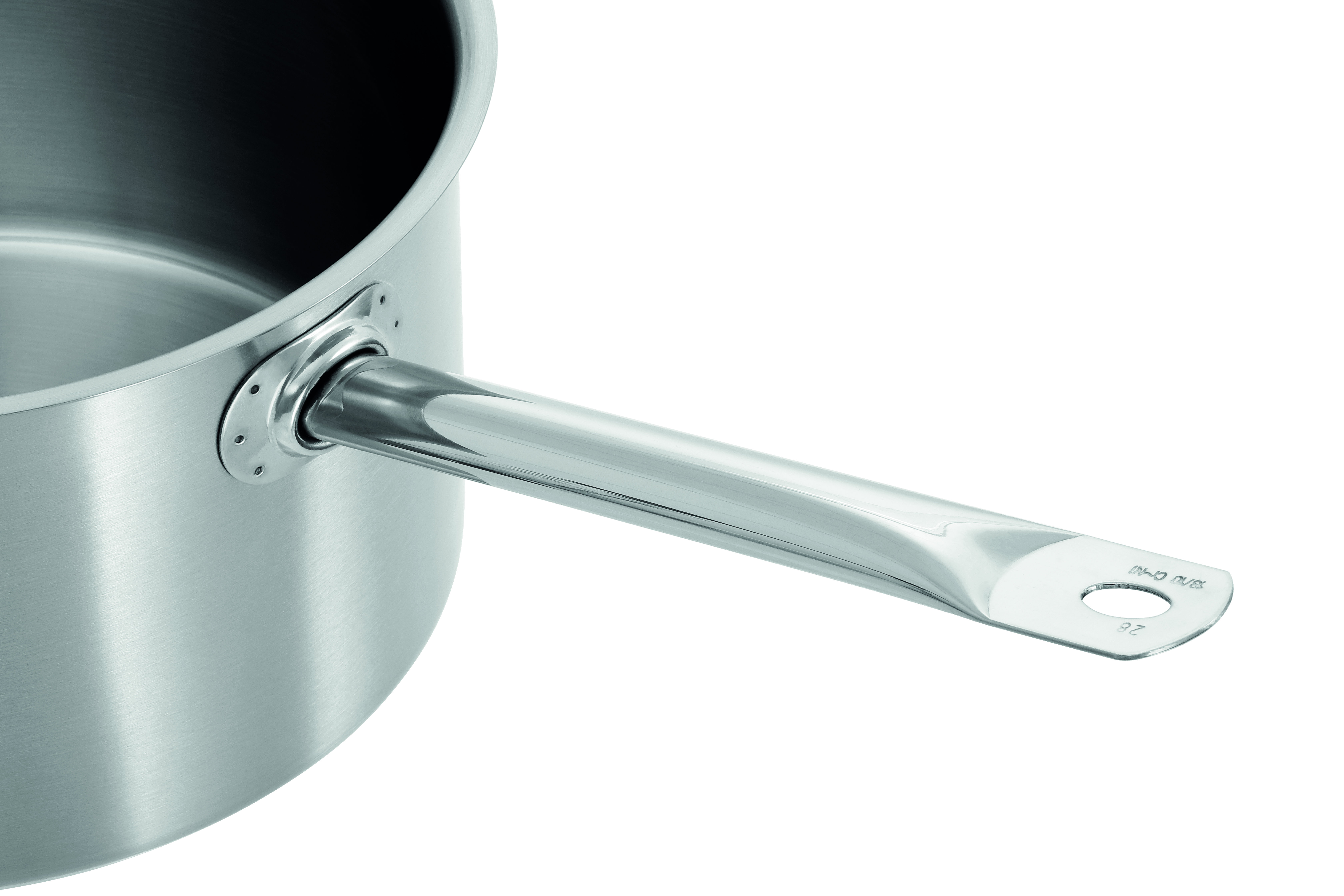Der Kochtopf aus Edelstahl ist ein Allrounder auf allen Herdarten. Mit dem fest angebrachten langen Griff garantiert er ein optimales Handling in der Küche.