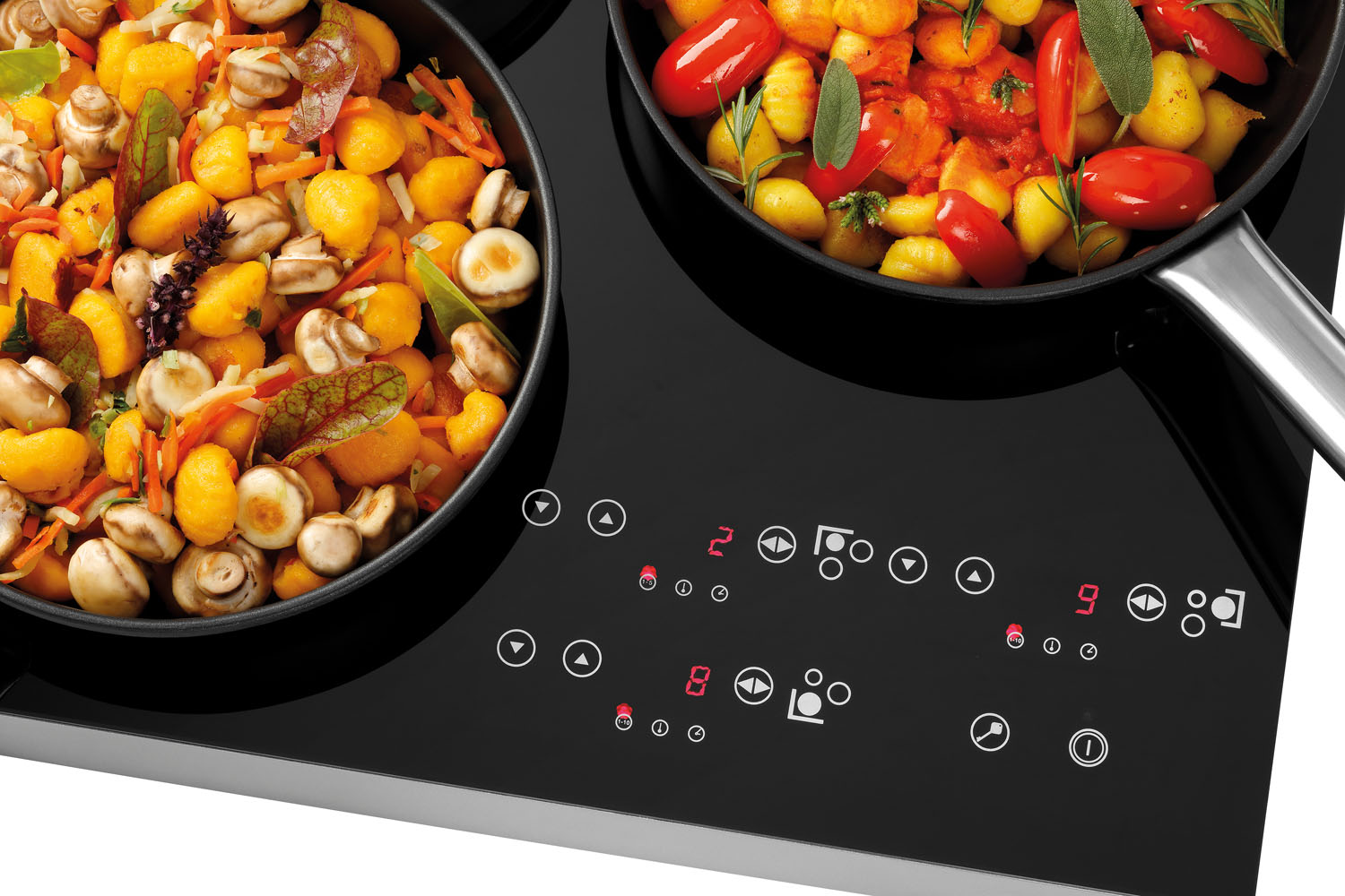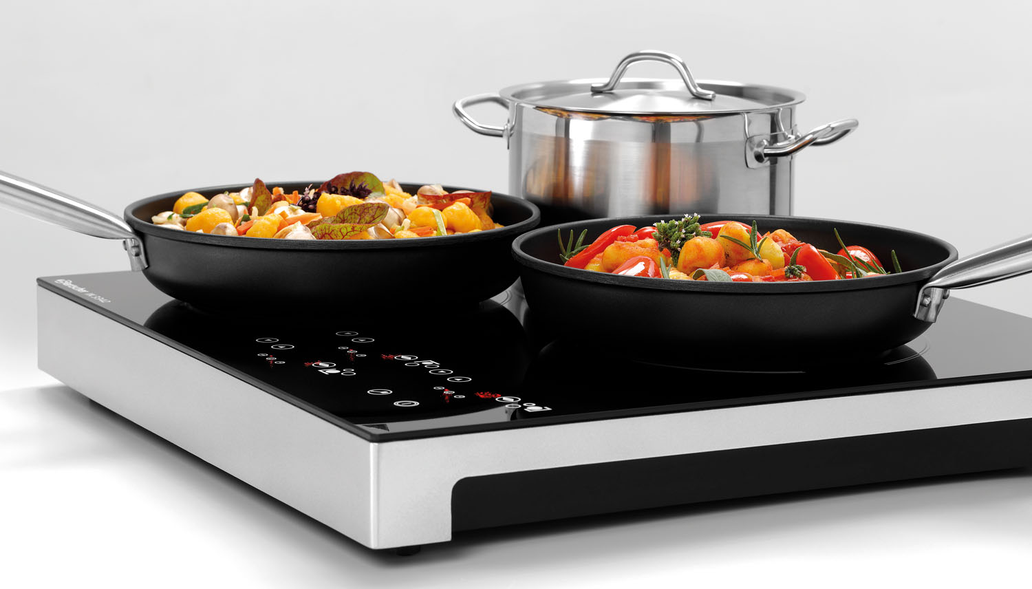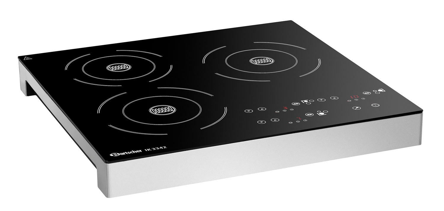 Induktionskocher mit 3 Kochstellen für den individuellen Gebrauch. Je nach Art der Speisenzubereitung können 3400 Watt entsprechend auf 3 oder auf 2 Kochstellen verteilt werden.