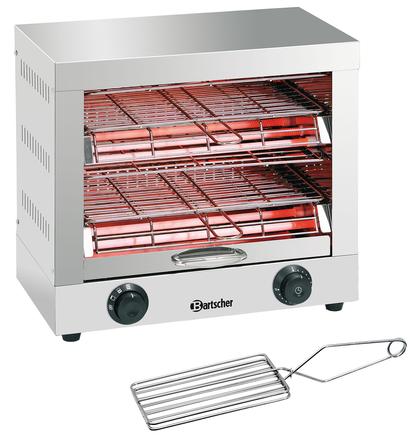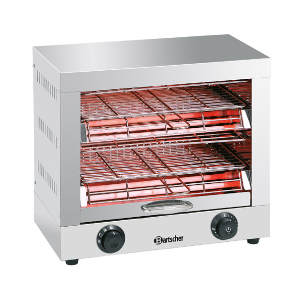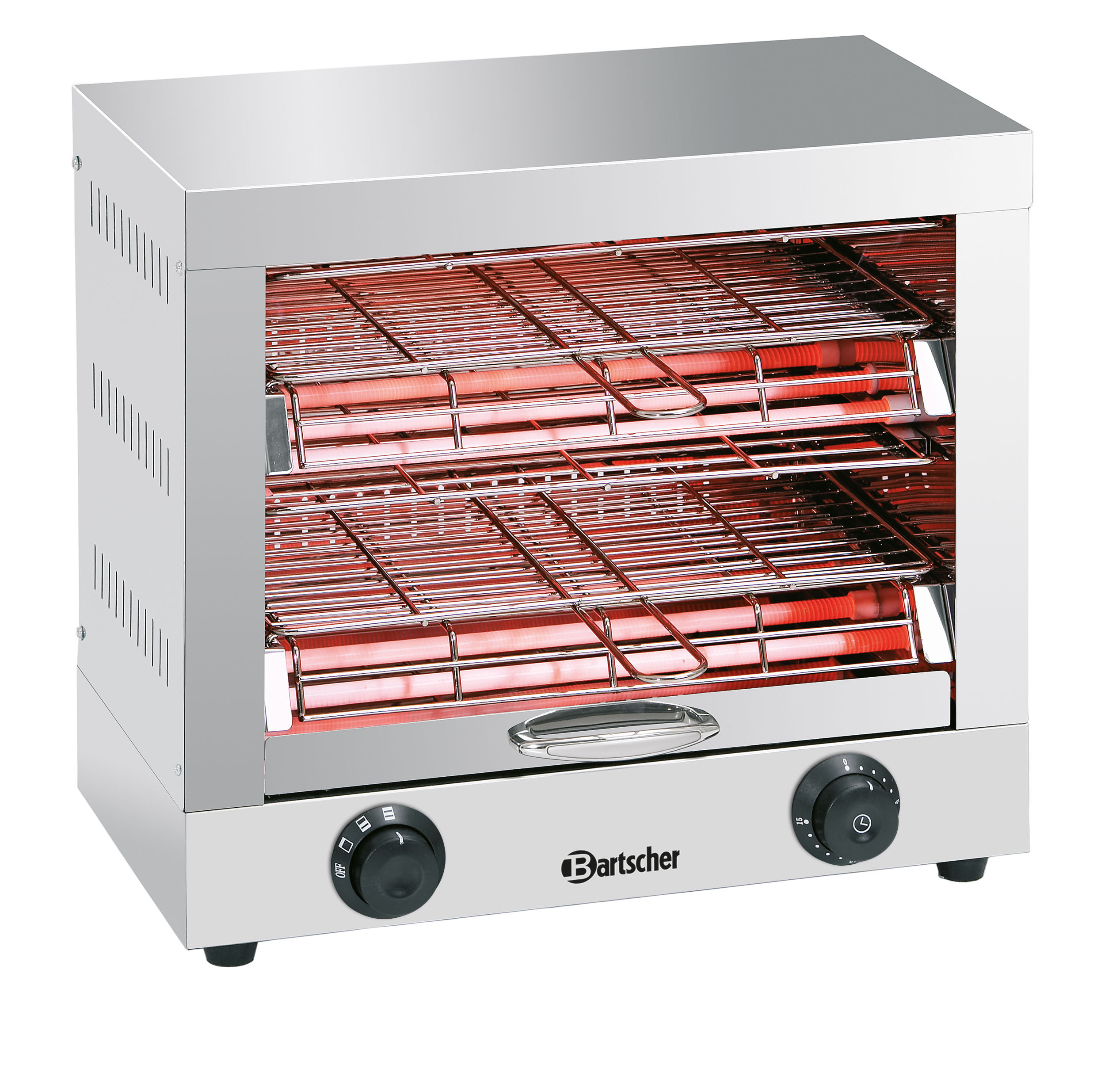 Dieser Toastofen von Bartscher besitzt zwei übereinander angebrachte Grillroste, wodurch mehr Speisen gleichzeitig überbacken werden können.