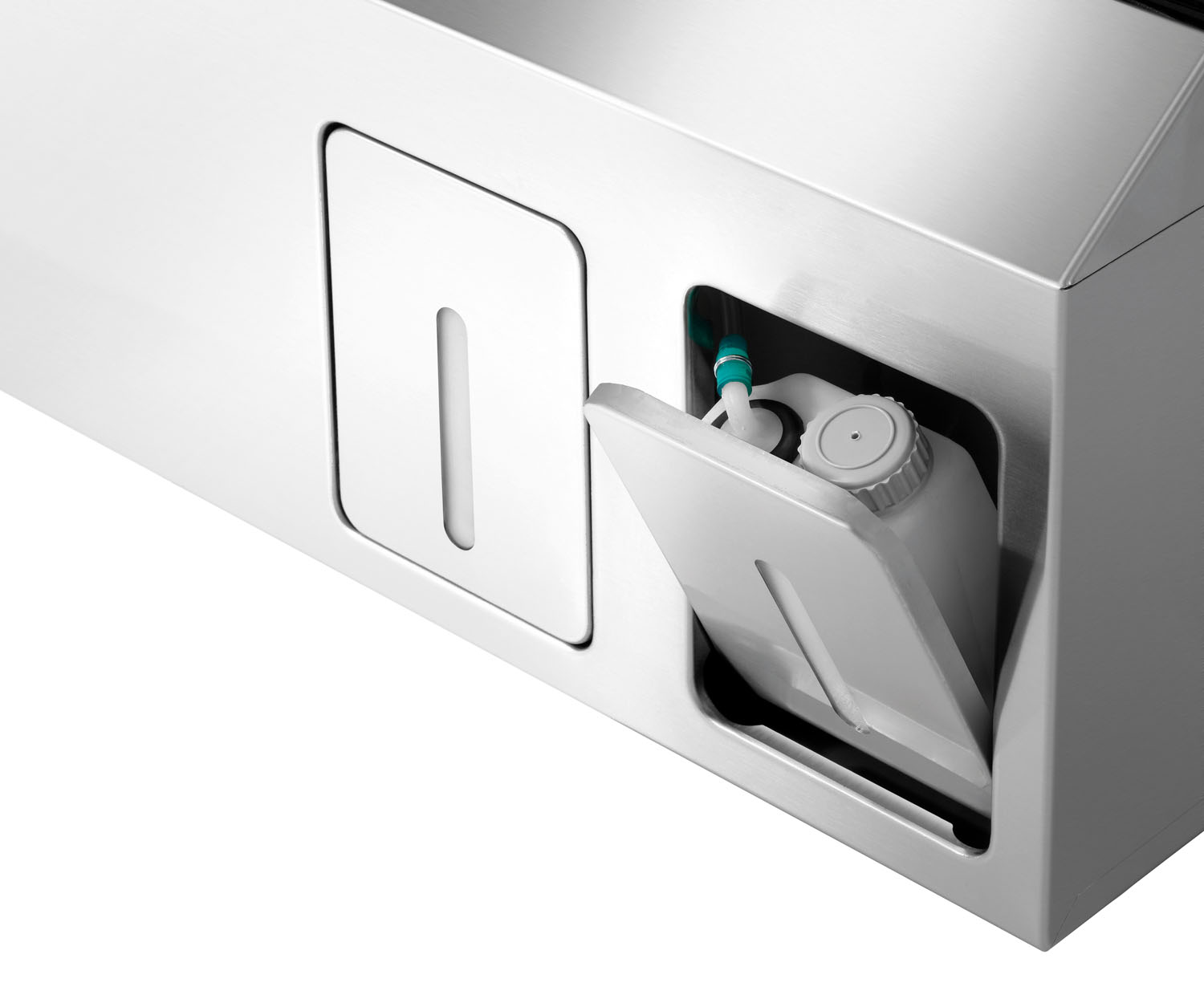 Die Spülmaschine mit einer platzsparenden Lösung für kleine Küchen und Spülküchen – Dank des vorgebauten Reinigungskits mit integrierten Kanistern für Reinigungsmittel und Klarspüler wird in der Küche kein weiterer Platz für Spülmaschinenzubehör wie Kanister und Schläuche benötigt.