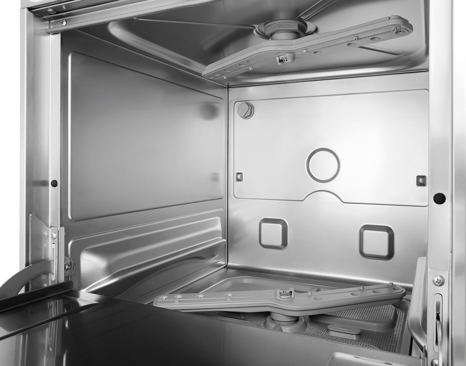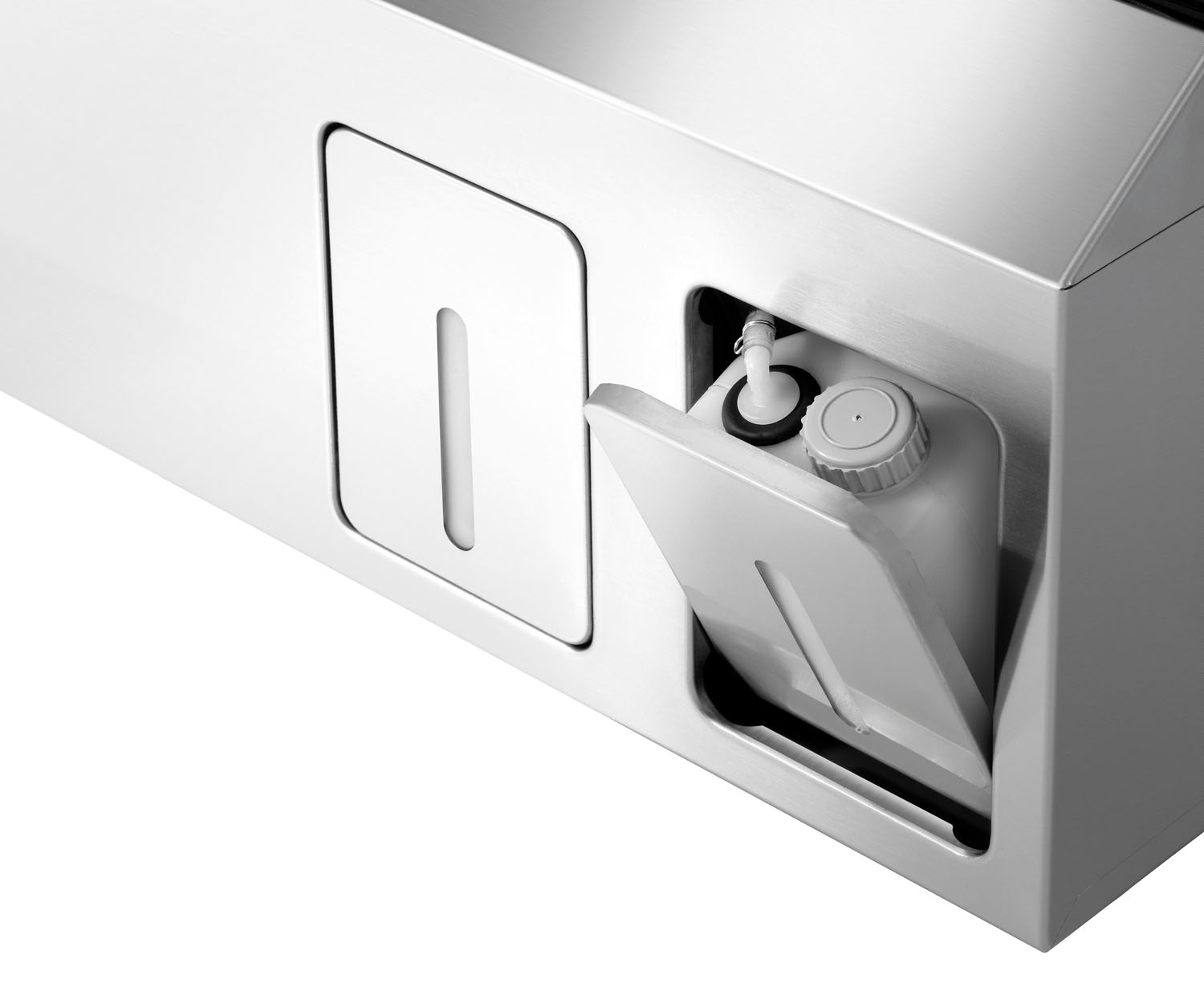 Die Gläserspülmaschine mit einer platzsparenden Lösung für kleine Küchen und Spülküchen – Dank des vorgebauten Reinigungskits mit integrierten Kanistern für Reinigungsmittel und Klarspüler wird in der Küche kein weiterer Platz für Spülmaschinenzubehör wie Kanister und Schläuche benötigt.
