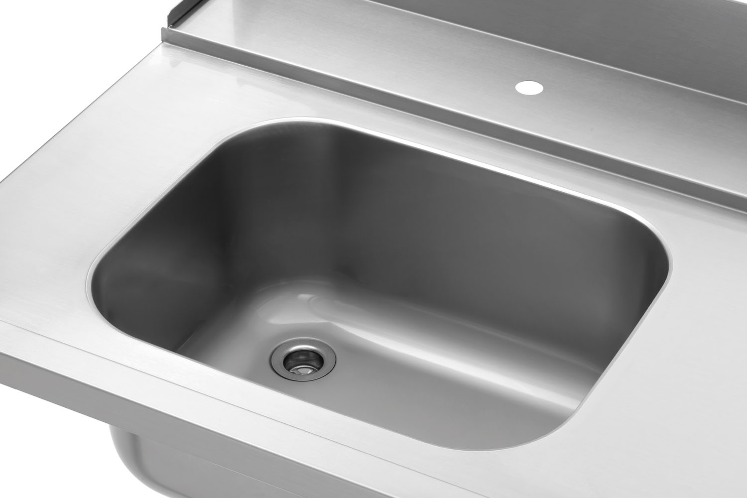 Vorabräumung mit Spüle und Abfallschacht passend zur Korbtransportspülmaschine KTS5000 für perfekt vorgereinigtes Geschirr, Tabletts oder Backbleche. Der Grundboden unterhalb der Spüle bietet Platz für die Lagerung von Spülkörben, Tablettkörben, Besteckköchern etc.