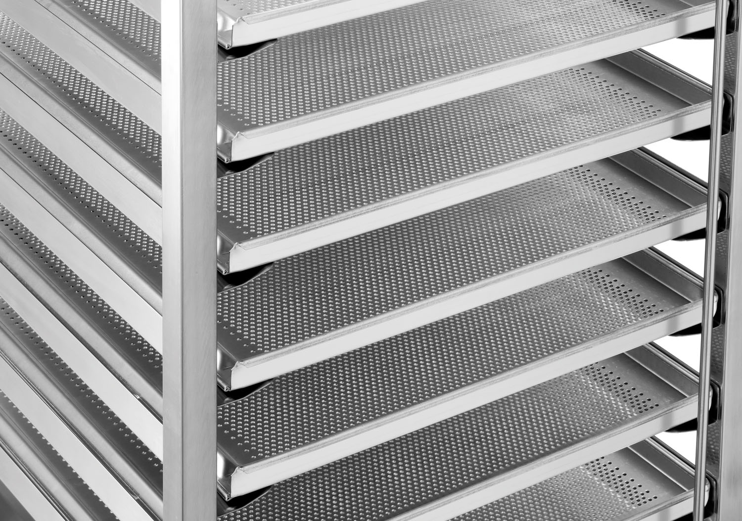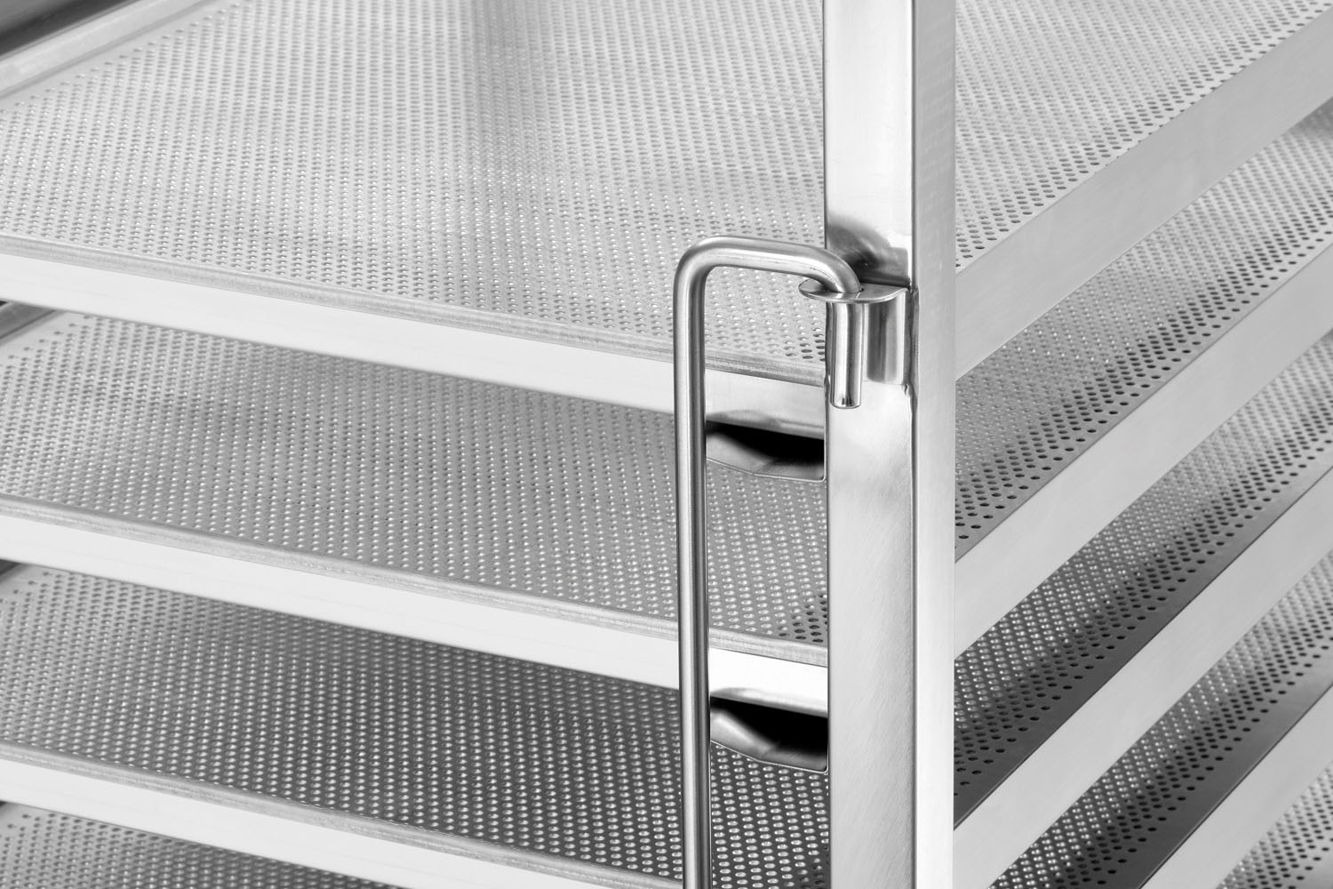 Der Abräumwagen für Bäckereien und Großküchen bietet Platz für 18 Bäckereinorm-Bleche mit einer Größe von 600 x 400 mm. Mit der beidseitigen Behältersicherung ist ein schnelles und sicheres Abräumen garantiert.
