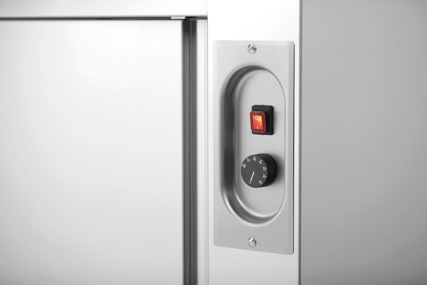 Der Wärmeschrank mit einer Breite von 1,6 Metern bietet einen stufenlos regulierbaren, beheizten Stauraum mit beidseitiger Bedienung. Mit der robusten Oberfläche aus Edelstahl integriert sich gleichzeitig ein solides Arbeitselement in die Küche.