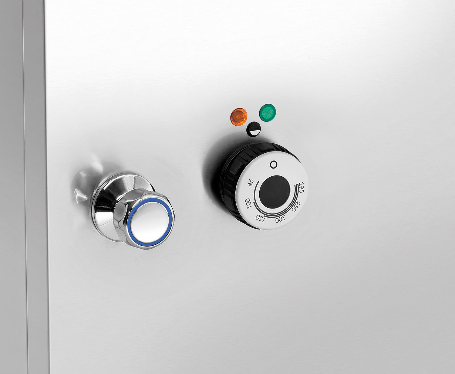 Kippbratpfanne der Serie 900 in bekannter hochwertiger Edelstahl-Ausführung. Der Tiegel ist vollständig aus Edelstahl und fasst bis zu 70 Liter. Das Elektro-Modell mit elektromotorischer Kippvorrichtung verfügt über einen Wassereinlaufhahn und ist ausgelegt für einen Kalt- oder Warmwasseranschluss.