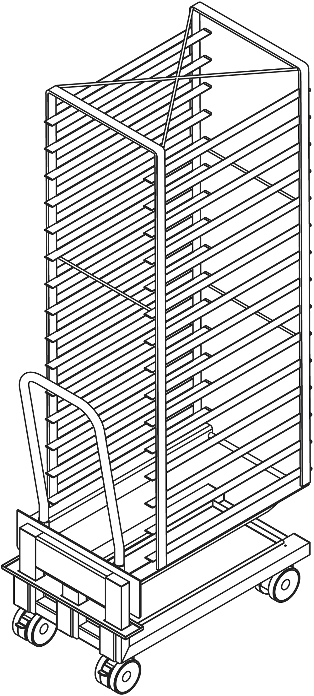 HORDENGESTELLWAGEN MIT FETTAUFFANGWANNE - KONDITOREIAUSFÜHRUNG - 600 X 400 - MAXIMALES GEWICHT 90 KG - MAXIMALES GEWICHT PRO BEHÄLTER 15 KG 470 x 745 x 1735 h 15 x (600 x 400) ↨ 89