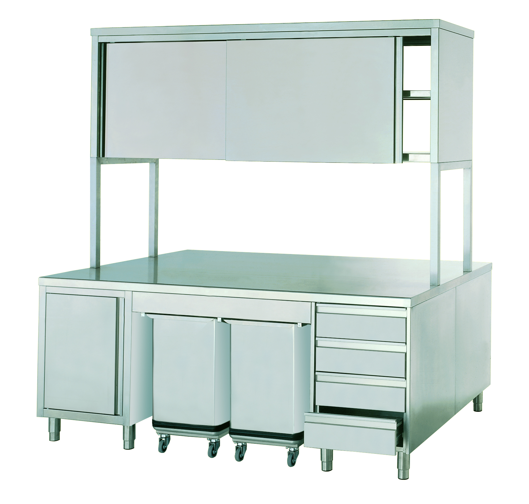 Ein Durchreicheschrank als aufgeständerter Aufsatz für Herdblöcke, Tischinseln und besonders für den Pass. Dieser Edelstahl Wandhängeschrank in der Höhe von 660 mm. Durch die Aufständerung beträgt die Gesamthöhe 1.200 mm. Sonderhöhen und Breiten sind jederzeit auf Anfrage als Edelstahl Sonderbaumöbel lieferbar. Der Tisch-Aufsatzschrank hat einen höhenverstellbaren Zwischenbord und beidseitig doppelwandigen Türen. Je nach Breite entweder als Flügeltür bis 1.000 mm oder als Schiebetürausfertigung. Und wenn Sie auf "Nummer Sicher" gehen möchten, haben Sie die Möglichkeit die Türen auch mit Schloss auszustatten. Mit dem klassischen Wandhängeschrank habe Sie die Möglichkeit auch Ihre Wandflächen zu nutzen. Mit diesem augeständertem Wandhängeschrank haben Sie zusätzlich noch die Chance "den Luftraum" zu nutzen ohne die Schränke an die Wand hängen zu müssen. Oftmals ist der Raum zu klein, die Wandflächen sind nicht nutzbar bzw. sind schon verplant, dann nutzen Sie diesen Tisch Aufsatzschrank. Somit verwandeln Sie zum Beispeil Ihren Pass an der Ausgabe oder Ihren Arbeitsplatz. Wie heisst es so schön, "nichts ist unmöglich". Optional haben Sie die Möglichkeit auch ein zusätzliches Zwischenbord mit zu bestellen.