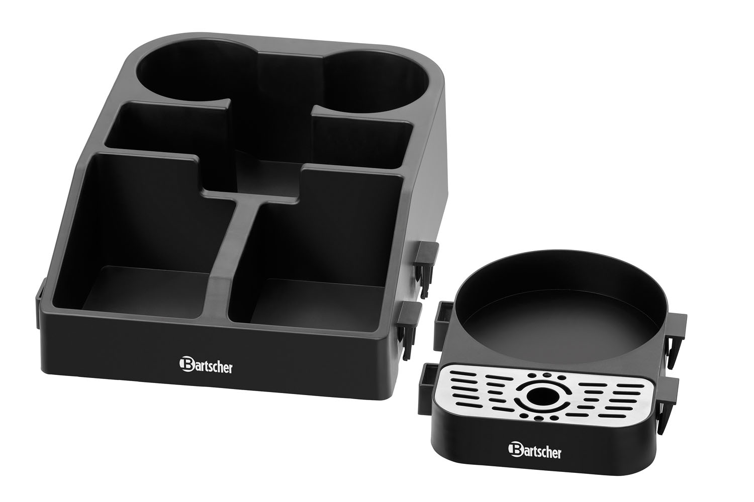 Gut sortiert und platzsparend können Becher, Rührlöffel und Co. mit der Z50 an Buffets und im Kaffee-Self-Service- oder Kassen-Bereich angeboten werden. Der Clou aber ist das Stecksystem: Je nach individuellem Bedarf sind die optional erhältlichen Abtropfschalen für Isolierkannen mit der Kaffeestation variierbar.