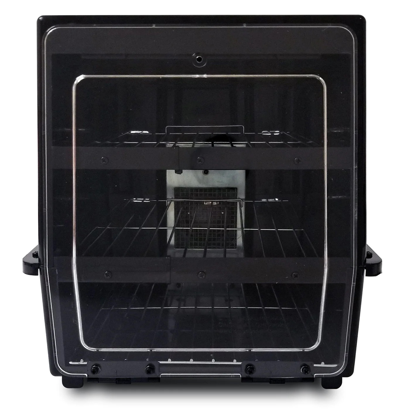 Platzsparendes Warmhaltegerät für Käsesoße • Fasst bis zu 33 Becher Käsesoße (je nach Größe) • Aufkleber „El Nacho Grande“ • Umluftwärme für eine gleichmäßige Wärmeverteilung im Innenraum • 3 Fächer mit jeweils 228 x 305 x 70 mm Raum • Kunststoff • Transparente Tür