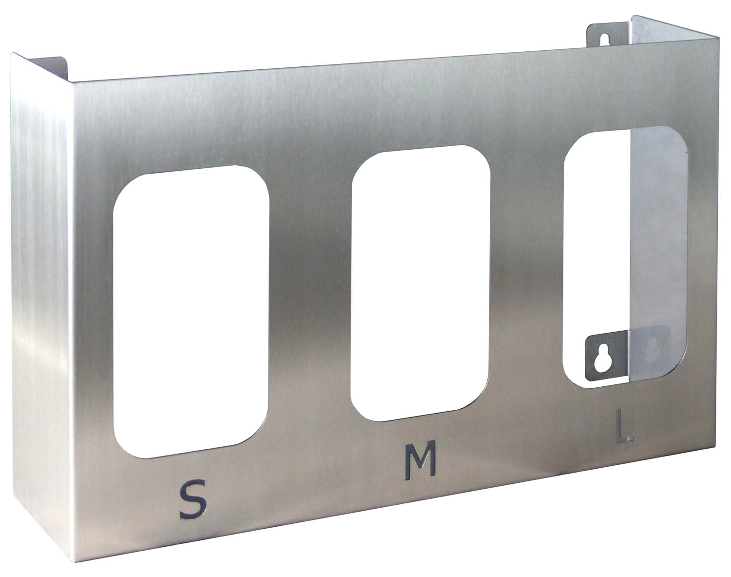 Praktischer Wandspender für Einweghandschuhe oder Handtuchboxen • Schnelle und hygienische Entnahme frischer Handschuhe • Immer griffbereit am Arbeitsplatz • Die Boxen werden einfach von oben in den Spender gesteckt • Markierung der 3 Öffnungen mit den Größenbezeichnungen S/M/L • Geeignet für 3 Verpackungen bis zu 230 x 120 x 80 mm Größe • Komplett aus Edelstahl: Rostfrei und einfach zu reinigen • Abstand der Bohrungen zur Wandbefestigung 340 mm waagerecht und 200 mm senkrecht • Inkl. Bohrschablone zur einfachen und sauberen Montage • Inkl. Montagematerial • Einweghandschuhe nicht im Lieferumfang enthalten