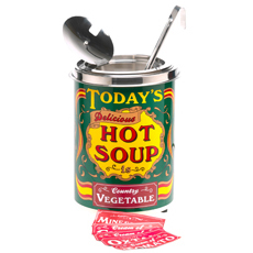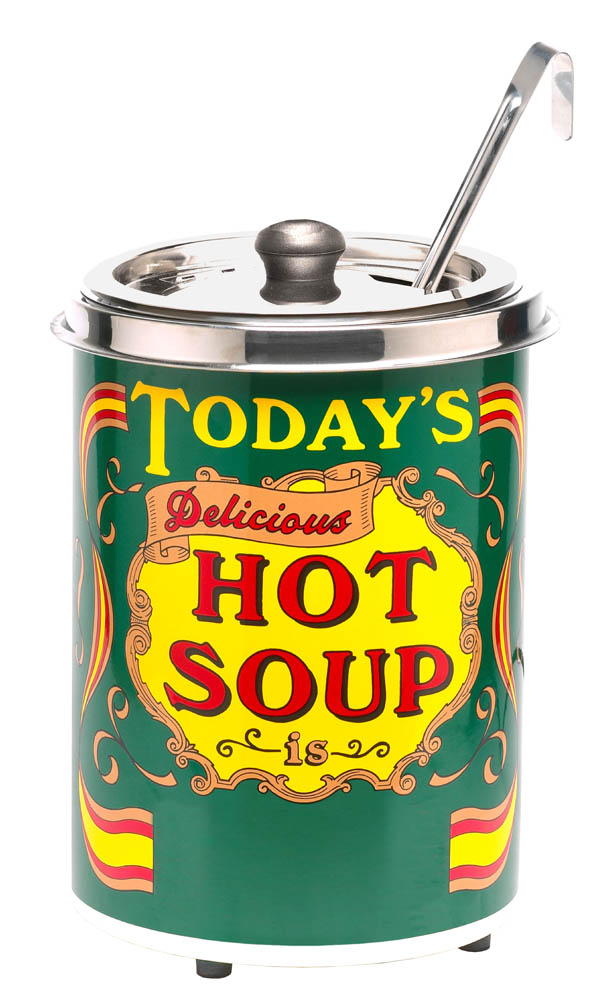 Neumärker bietet hier mit diesem 5 Liter HOT-POT Suppentop ein extrem schönes tockenbeheiztes Wasserbad an. Dieses kann trockenbeheizt genutzt werden, was besonders im Bereich des Büffetbereiches viel weniger Arbeit verursacht, da Sie sich das ständige Wassernachfüllen sparen. Der Suppentopf-Einsatz ist herausnehmbar und hochwertigst aus Edelstahl gefertigt. Zur einfacheren Bedienung ist der Edelstahldeckel klappbar und mit einer Löffelaussparung versehen. Der Außenkörper des Suppentopfes ist mit einbrennlackierten nostalgischen Aufkleber versehen, der Innenbereich aus Edelstahl. Besonders lobenswert ist der Simmerstat des Suppentopfes.