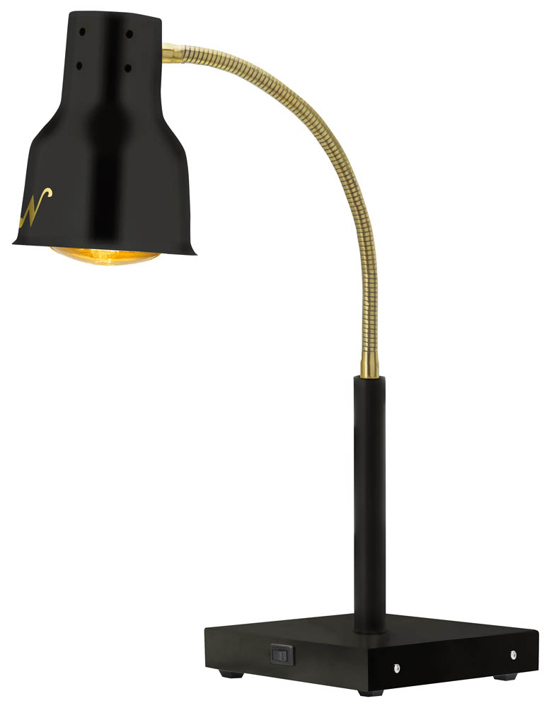 flexibler Arm mit Hygieneschutzschlauch • Schalter gegen versehentliches Umschalten geschützt • Schirm außen matt-schwarz, innen gold lackiert • inkl. Infrarot-Leuchtmittel (weißes Licht)