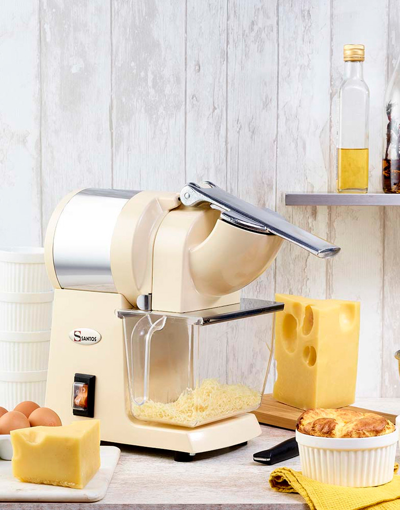 Automatische Käsereibe für Restaurants, Pizzerien oder den Lebensmitteleinzelhandel • Robust und Leistungsstark für den professionellen gastronomischen Einsatz • Reibscheibe mit Löchern à Ø 3 mm, geeignet für mittelharten Käse wie Gouda oder Emmentaler • Weitere Reibscheiben auf Anfrage erhältlich • Sicherheitsschalter stoppt beim Öffnen oder bei Entnahme des Behälters • Einfüllschacht mit leicht zu bedienendem Druckhebel • Gehäuse Edelstahl und Aluminiumguss • Cremefarbene, antimikrobielle Beschichtung • Einfache Reinigung • Transparenter Auffangbehälter mit 800 g Fassungsvermögen • Durchschnittliche Leistung ca. 50 kg/Stunde